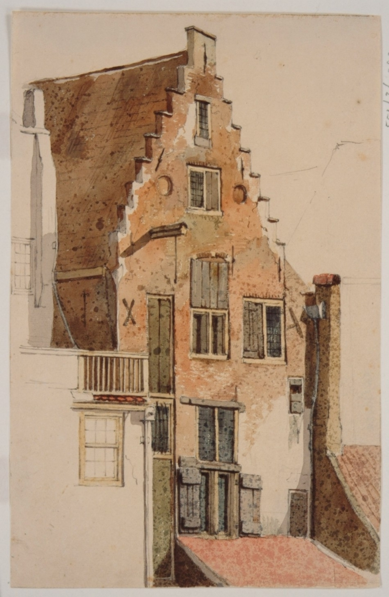 - hxb: 29,5 x 19 cm. Een van de in 1841 gesloopte huizen, wier plaats ingenomen is door het gebouw van de Boterbeurs, later Lees-Museum. Zie de voorgevel op nr. DI 509 en DI 510.