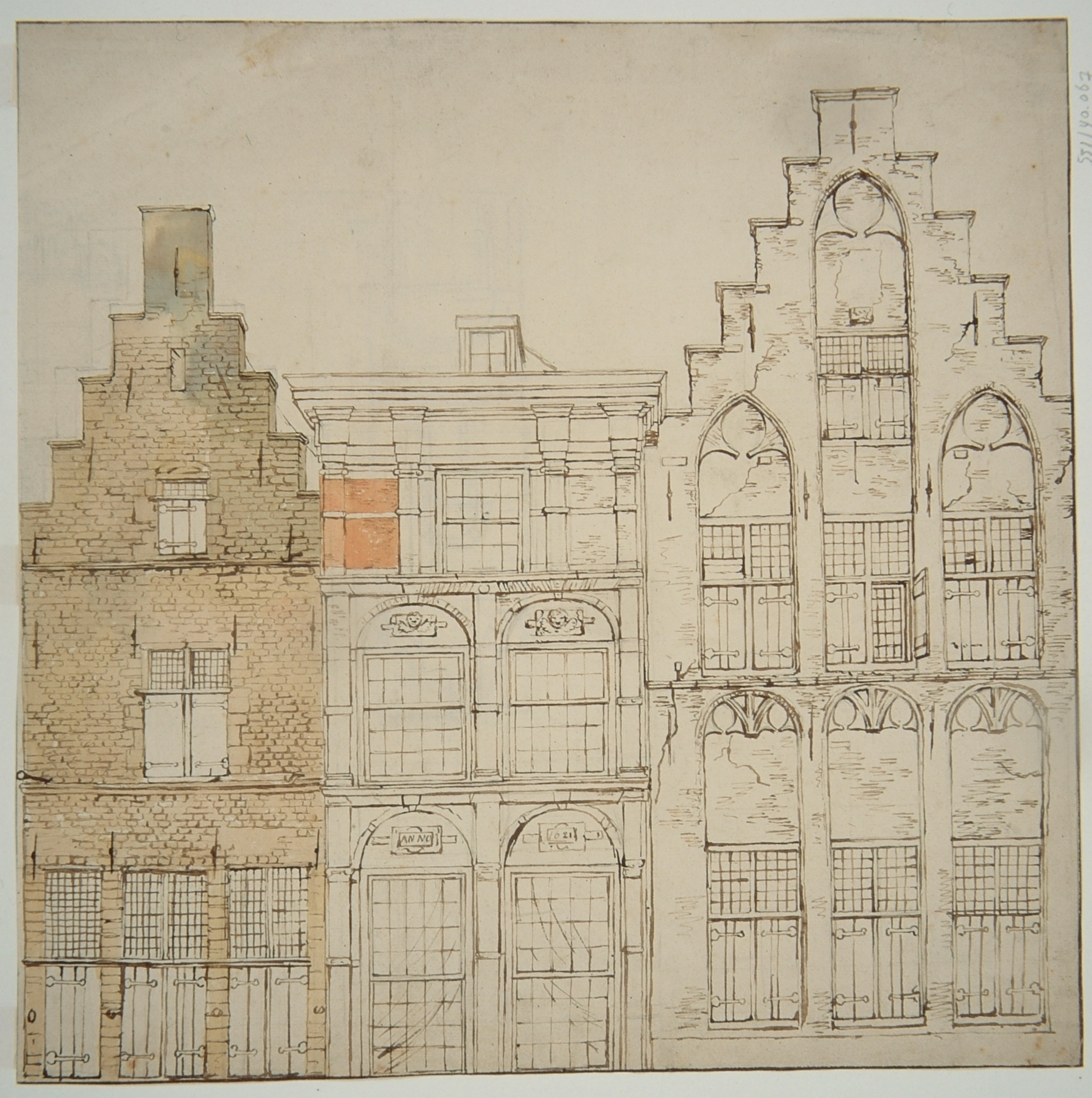 Drie bovengevels van inmiddels gesloopte huzen aan de Voorstraat, destijds genummerd …