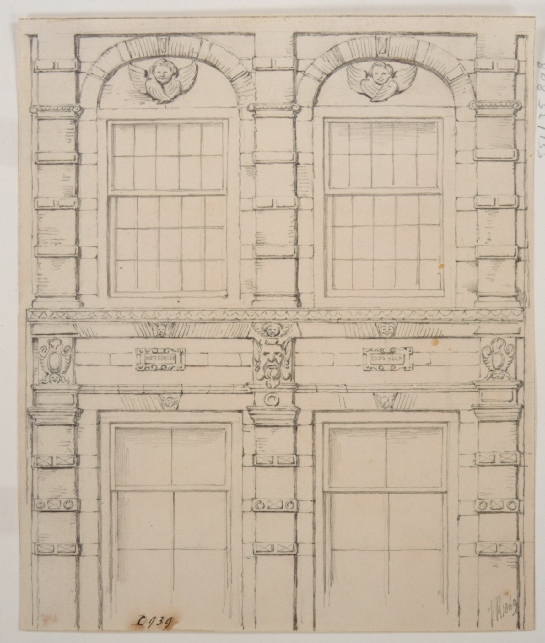 - Voorstraat 146; gevel van huis De Kelk, 1e helft XVIIe eeuw met opschr.: Niet sonder Gods hulp