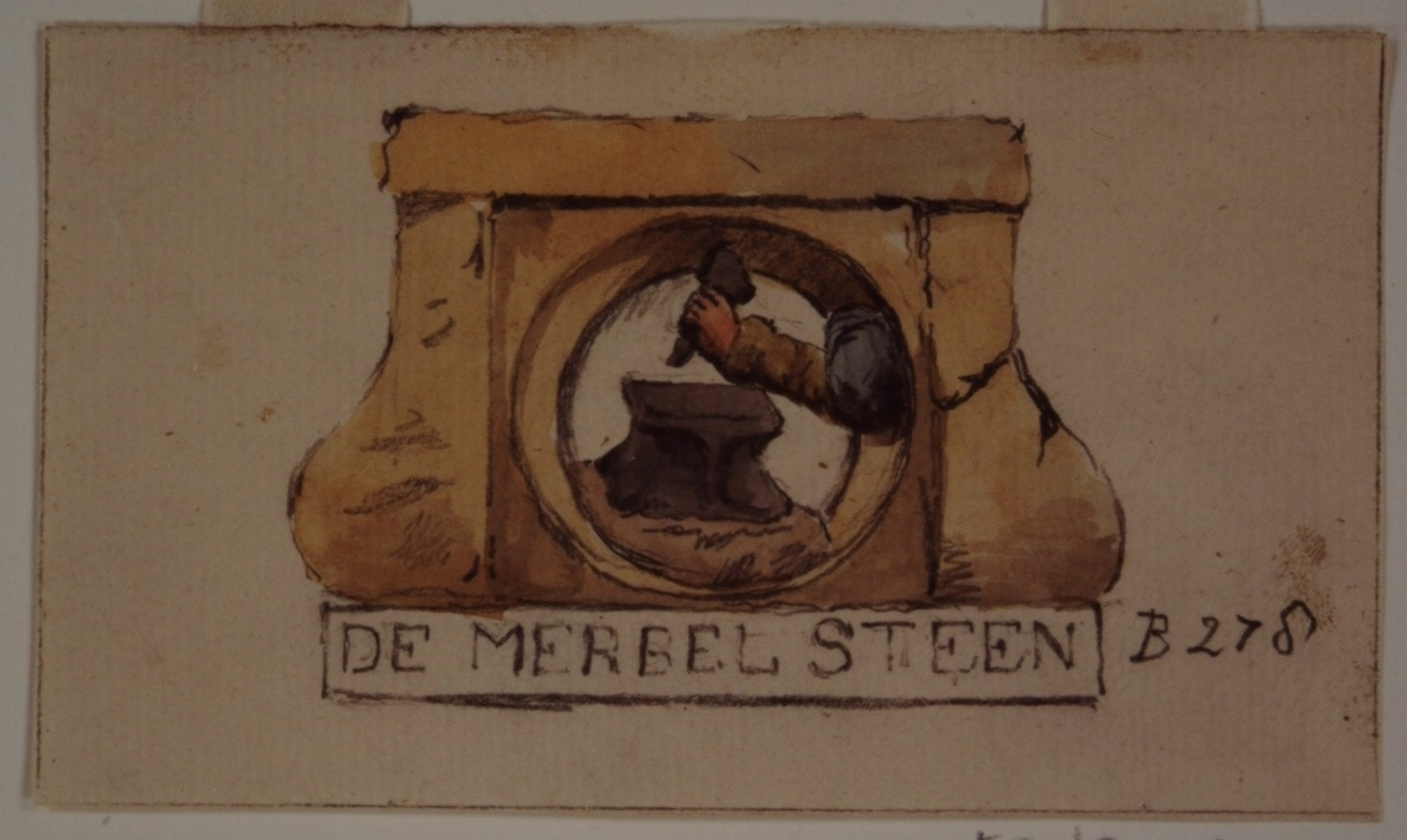 - Gevelsteen van het pand Kuipershaven 70, met afgebeeld een smidsaambeeld met daarboven een hand met hamer en daaronder de naam De Merbelsteen