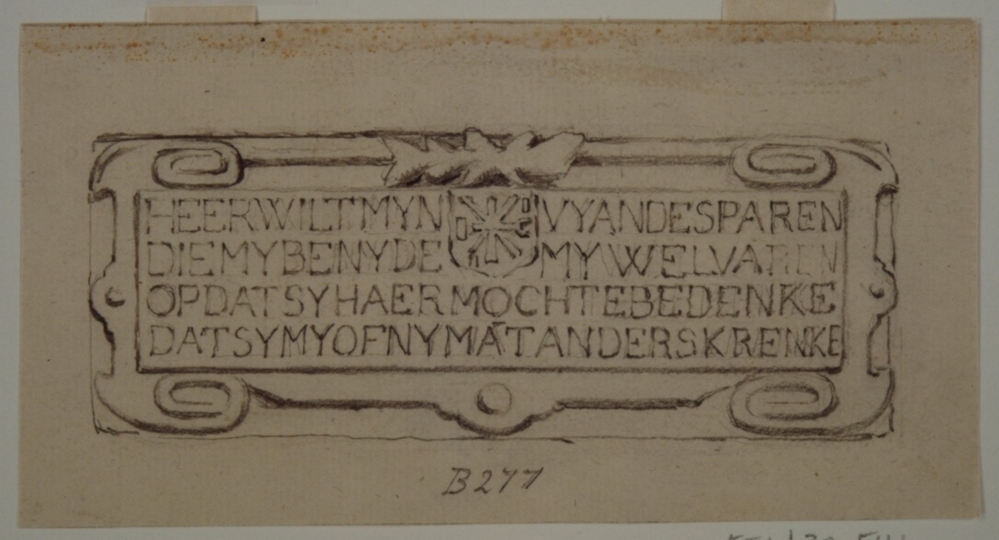 - Gevelsteen in de zijgevel aan de Kuipershaven van het huis Sint Joost, Gravenstraat 43, met een wapen waarin een huismerk en de tekst: HEER WILT MIJN VYANDE SPAREN DIE MY BENYDE MY WELVAREN OPDAT SY HAER MOCHTE BEDENKEN DAT SY MY OF NYMA(N)T ANDERS KRENKE