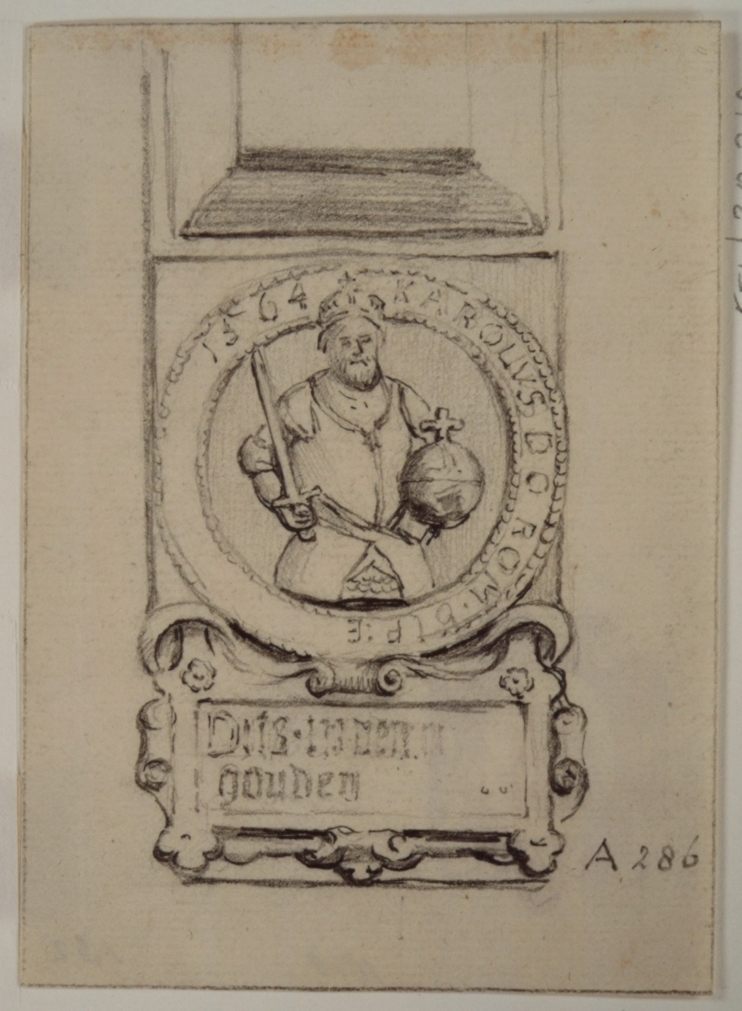 Gevelsteen van het pand Groenmarkt 33, met een voorstelling van een reaal (munt) waarop keizer Karel en het jaar 1564; het onderschrift luidt: dits in den ouden gouden reael