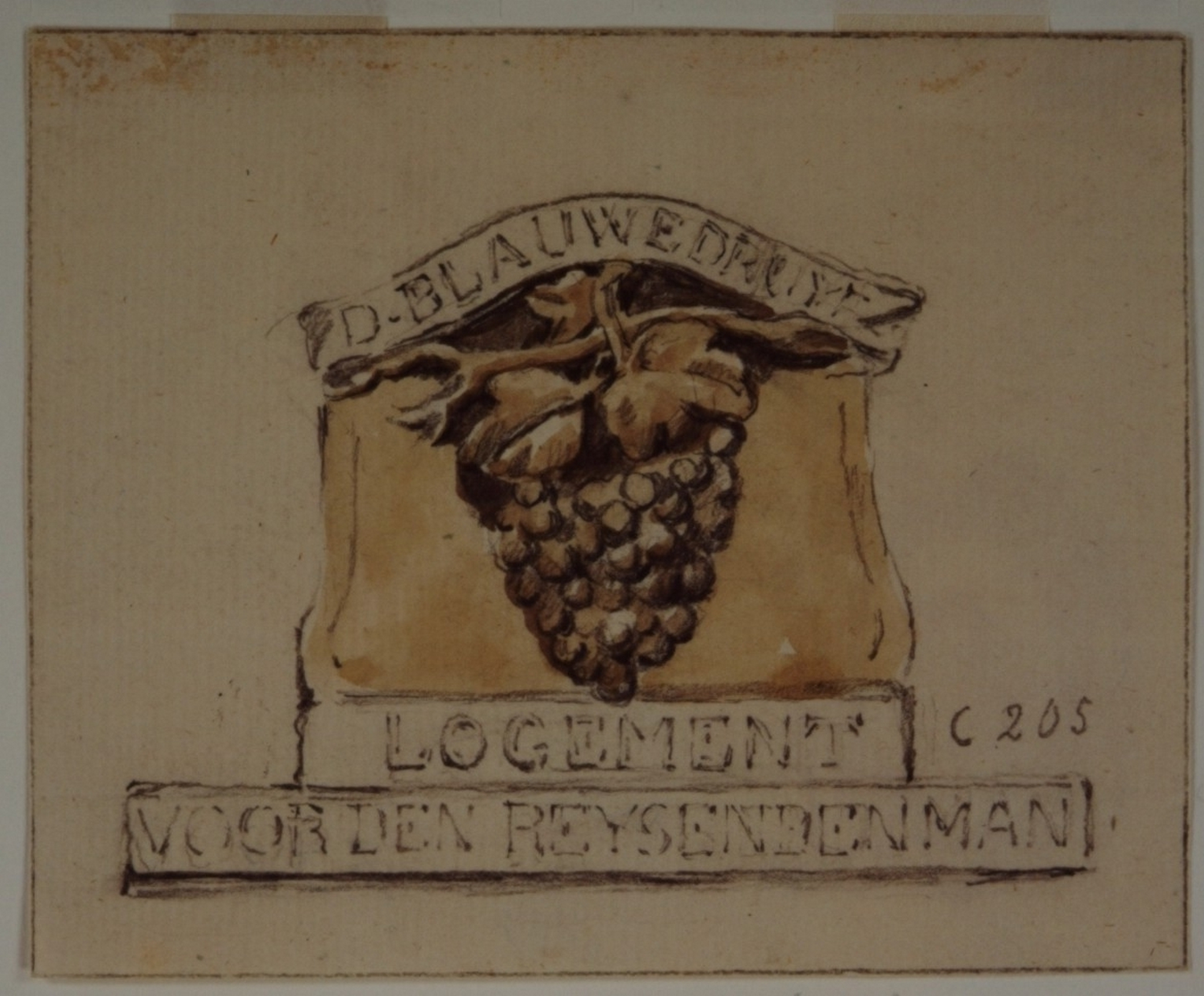 - Gevelsteen van het pand Riedijk 37 met een afbeelding van een druiventros met de tekst: D. BLAUWE DRUYF LOGEMENT VOOR DEN REYSENDEN MAN