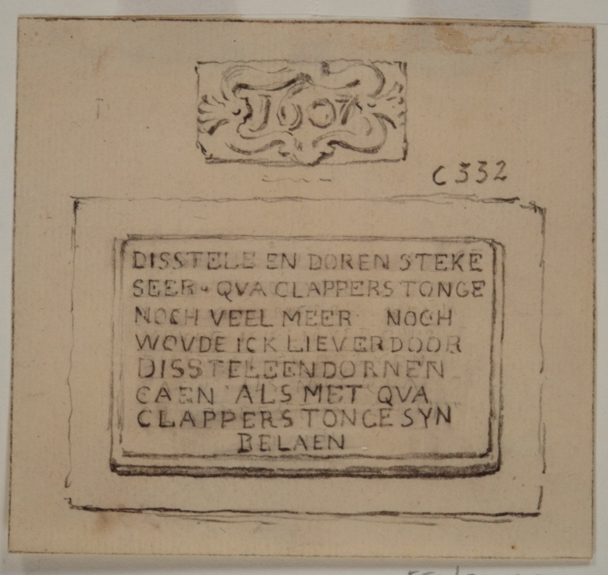 Gevelsteen van het huis Riedijk 60 met de tekst: DISSTELE EN DOREN STEKE SEER. QUACLAPPERS TONGE NOCH VEEL MEER. NOCH WOUDE ICK LIEVER DOOR DISSTELE EN DORNEN GAEN, ALS MET QUACLAPPERS TONGE SIJN BELAEN; op een afzonderlijk steentje het jaartal 1607 en voort nog een steentje met jaartal 1607.