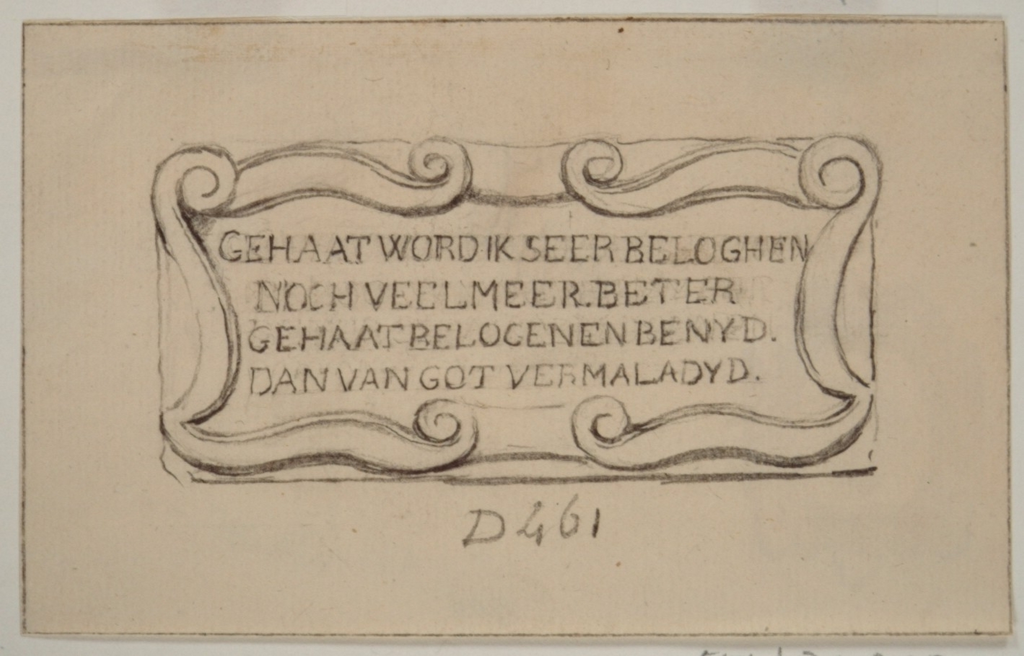 - Gevelsteen van het huis Grote Spuistraat 17 met de tekst: GEHAAT WORD IK SEER BELOGHEN NOCH VEEL MEER. BETER GEHAAT BELOGEN EN BENYD DAN VAN GOT VERMALADYD.