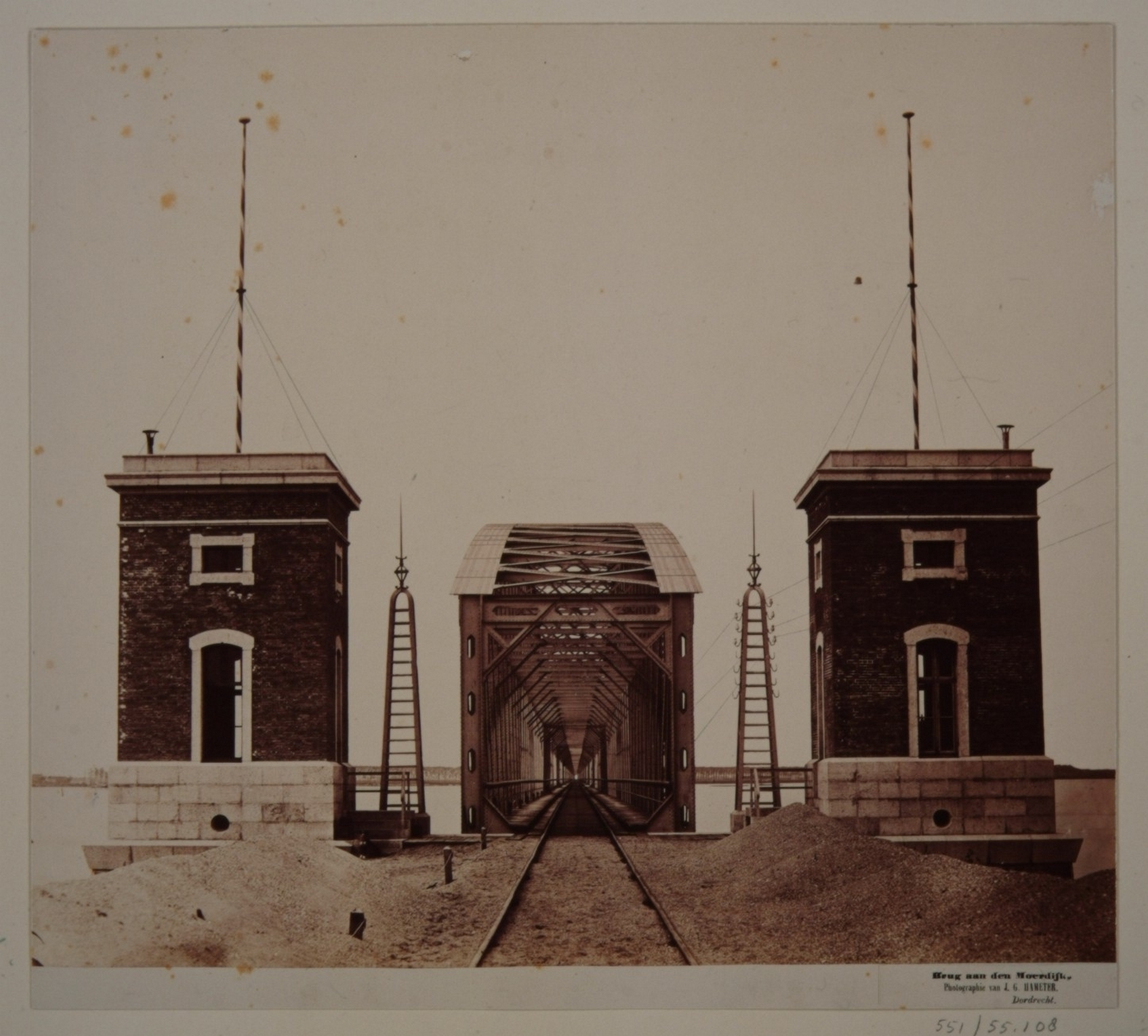 Spoorbrug over Hollandsch Diep is gereed: zicht op uiteinde brug met wachthuizen aan de …