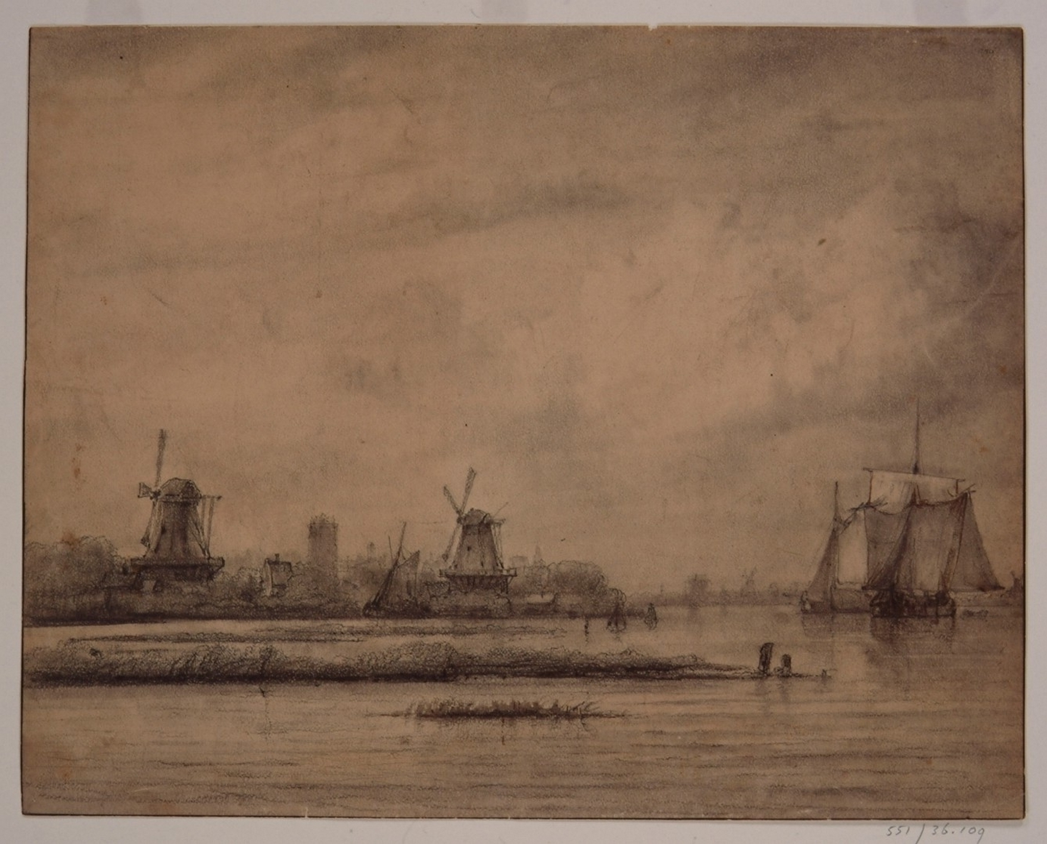Biesbosch ca. 1860?; links de molens aan de Lijnbaan.