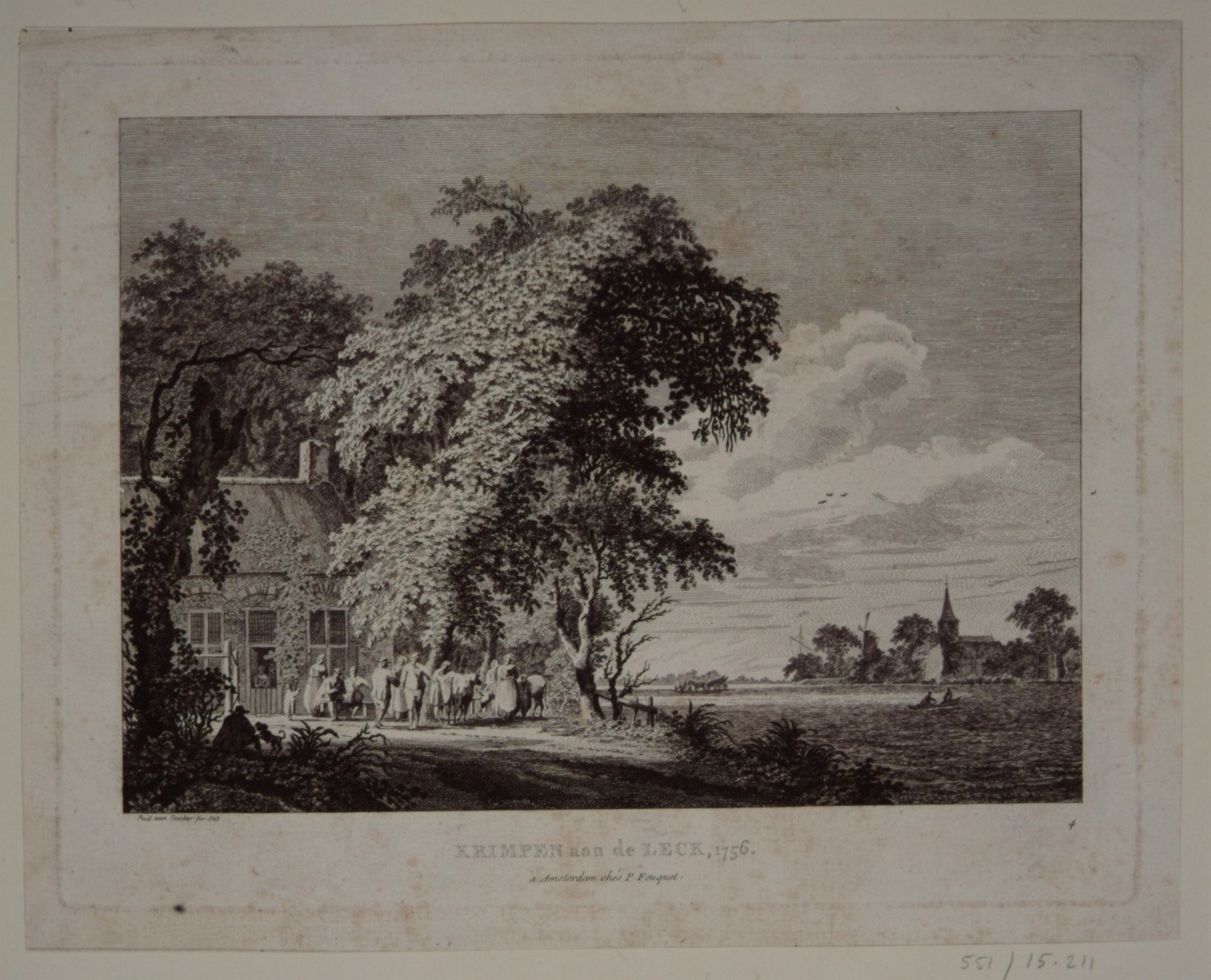 Gezicht vanaf een lommerrijke uitspanning aan de overzijde van de rivier op het dorp Krimpen aan de Lek in 1756.