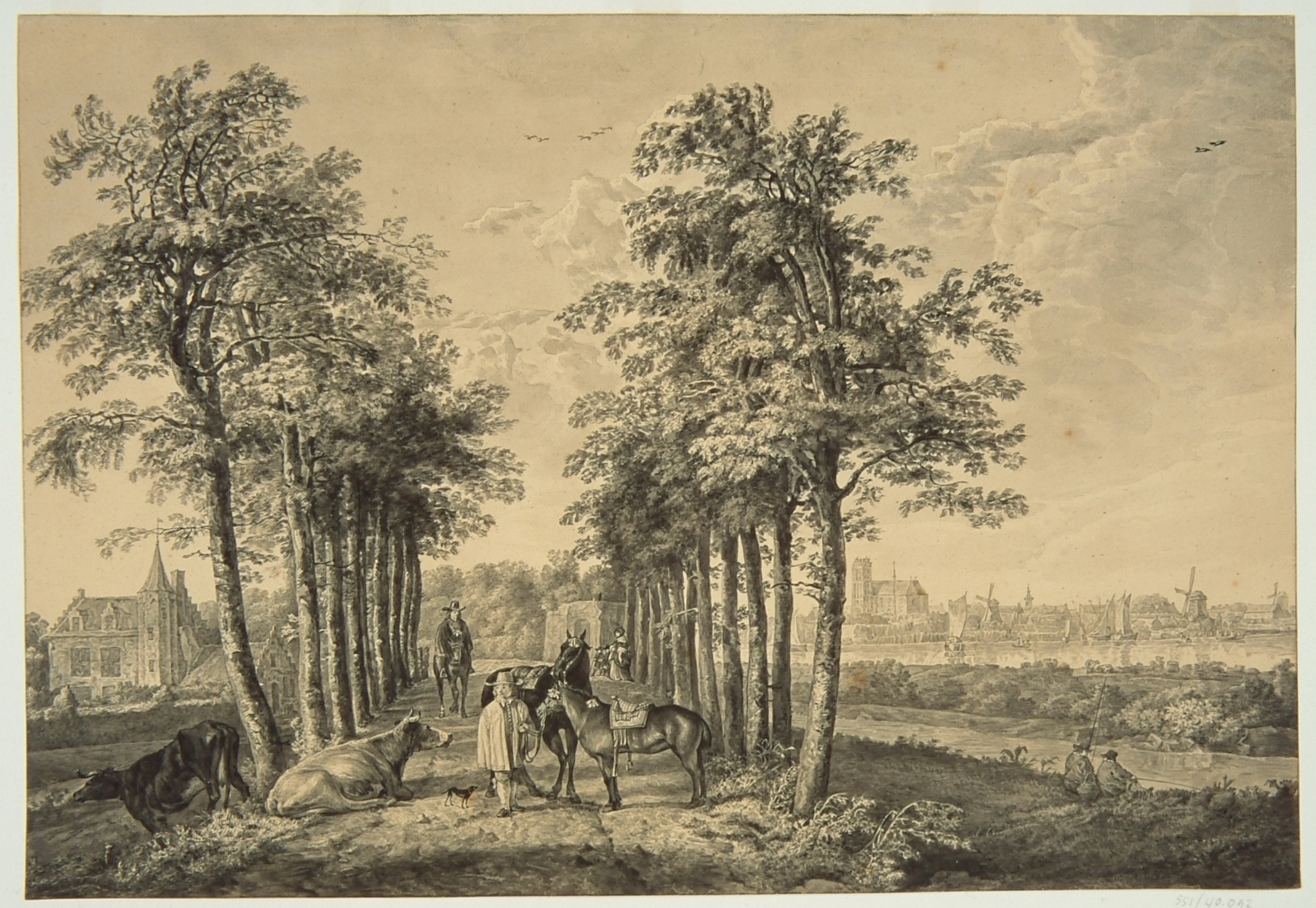 - Gezicht uit omstreeks 1660 op de dijk tussen Zwijndrecht en Groote Lindt met vee en reizigers; links binnendijks het huis te Meerdervoort; rechts de rivier de Oude Maas met de stad Dordrecht in het verschiet.