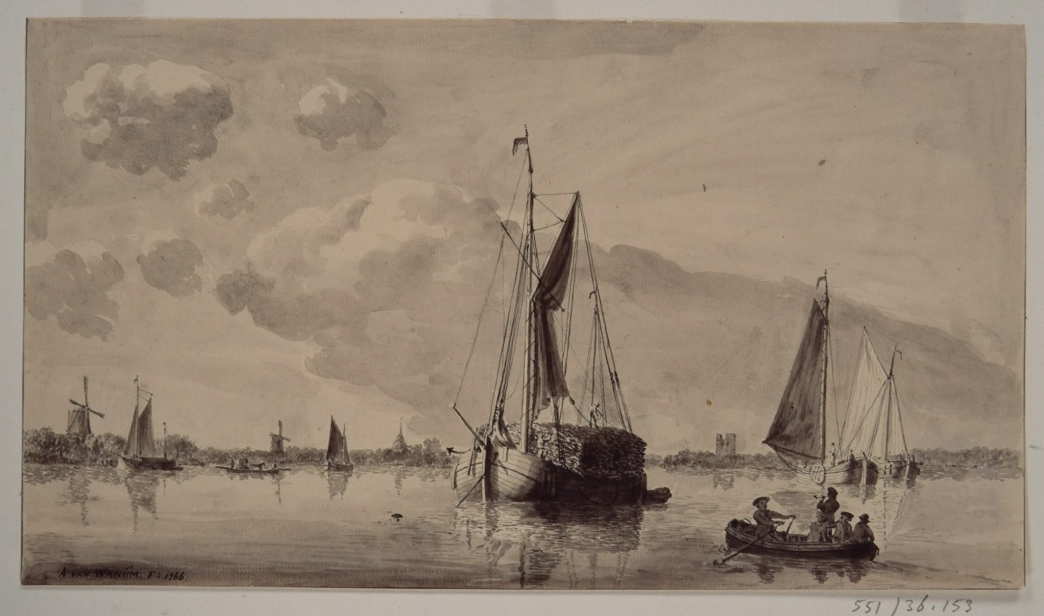 - Merwede, anno 1766; ter hoogte van het Papendrechtse veer; rechts op de achtergrond de ruïne van Huis te Merwede.