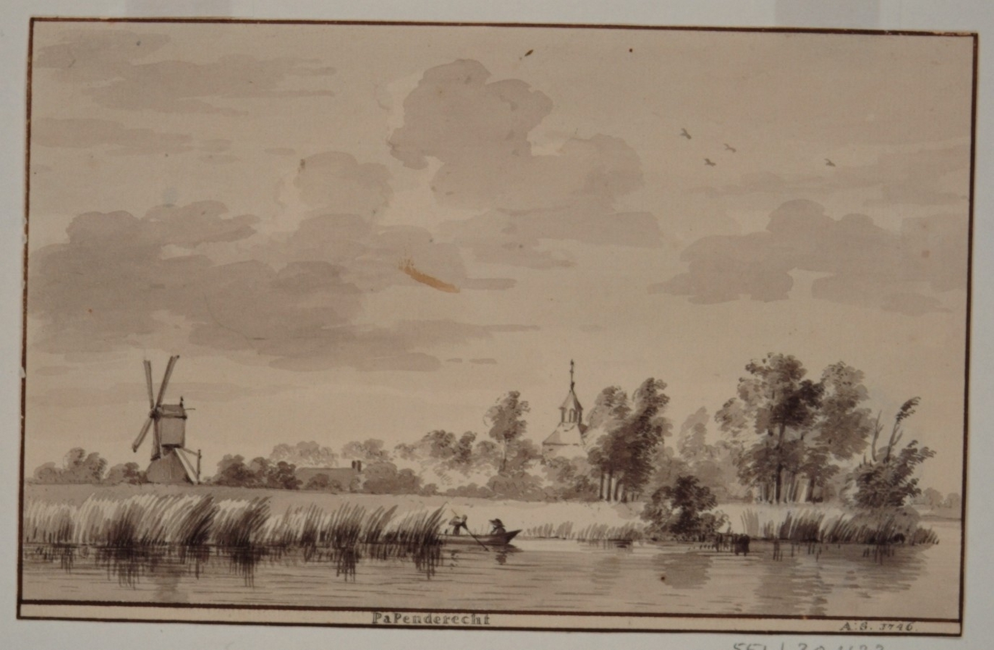 Molen en kerk van Papendrecht zijn hier gezien vanaf de Merwede. Vgl. inv.nr. 551_36186.