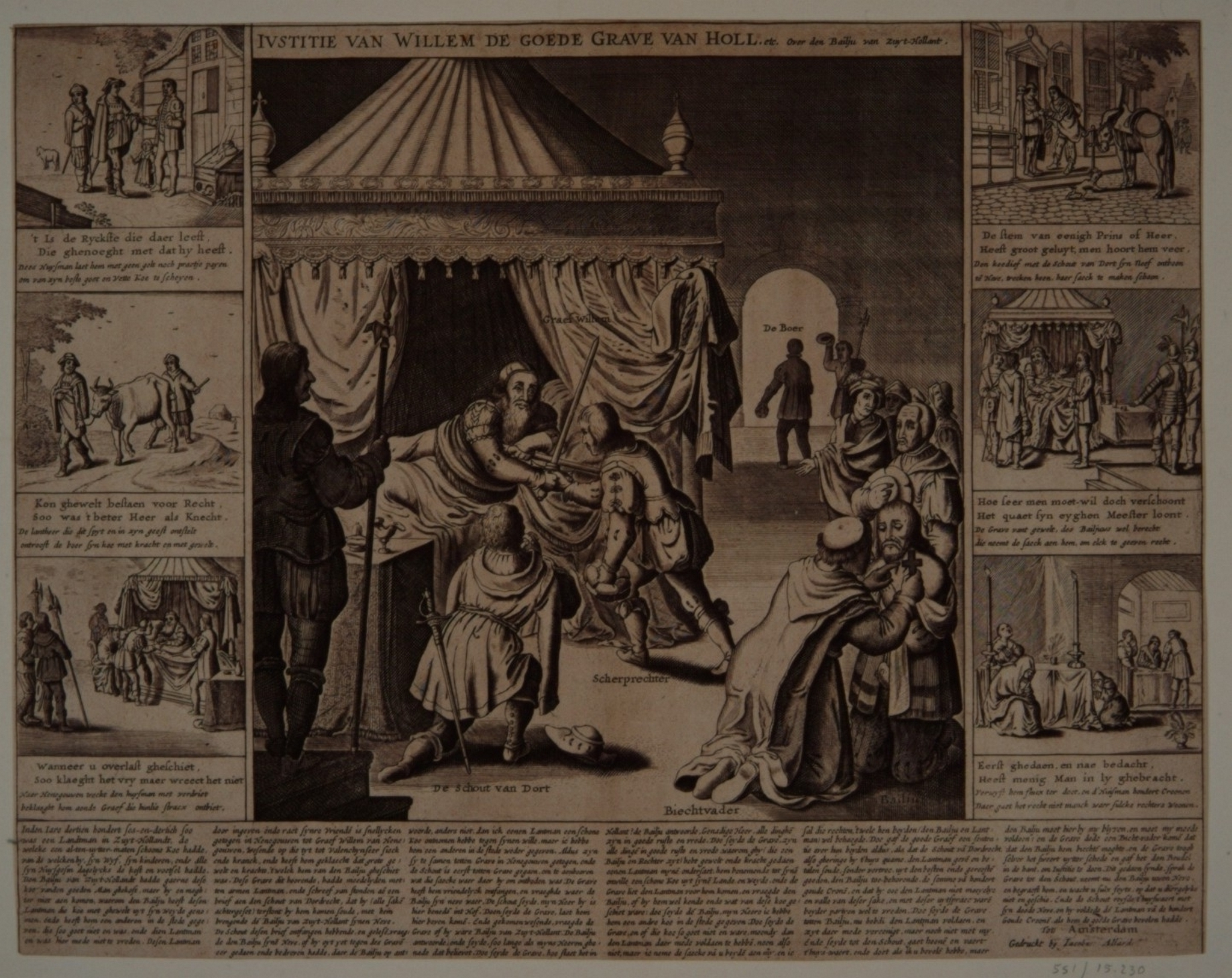 - 'Goede Justitie van graaf Willem III', die in 1336 zelf ziek te bed liggende te Valenciennes, de scherprechter het zwaard geeft om de baljuw van Zuid-Holland te onthoofden, die een boer in Oudelands-Ambacht een mooie koe had ontnomen en hem daarvoor een minderwaardige in de plaats had gegeven; om de prent zes kleinere met verschillende episoden van het verhaal dat in zes kolommen onderaan de prent verteld wordt.