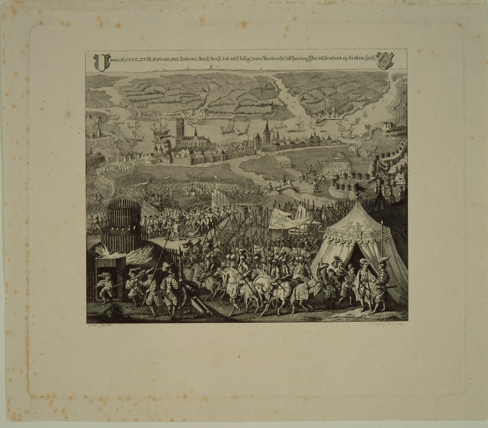 - Afbeelding van het opbreken van het beleg van Dordrecht door Jan van Brabant.op 8 augustus 1418; Dordrecht in vogelvlucht met links vooraan een brandend aanvalswerk, in het midden oprukkende ruiters en aan de rechterkant Hertog Jan voor een veldtent; daarachter speelt zich een veldslag af. Boven de afbeelding hangen de wapens van Dordrecht en Beieren met daartussen een eenregelig opschrift.