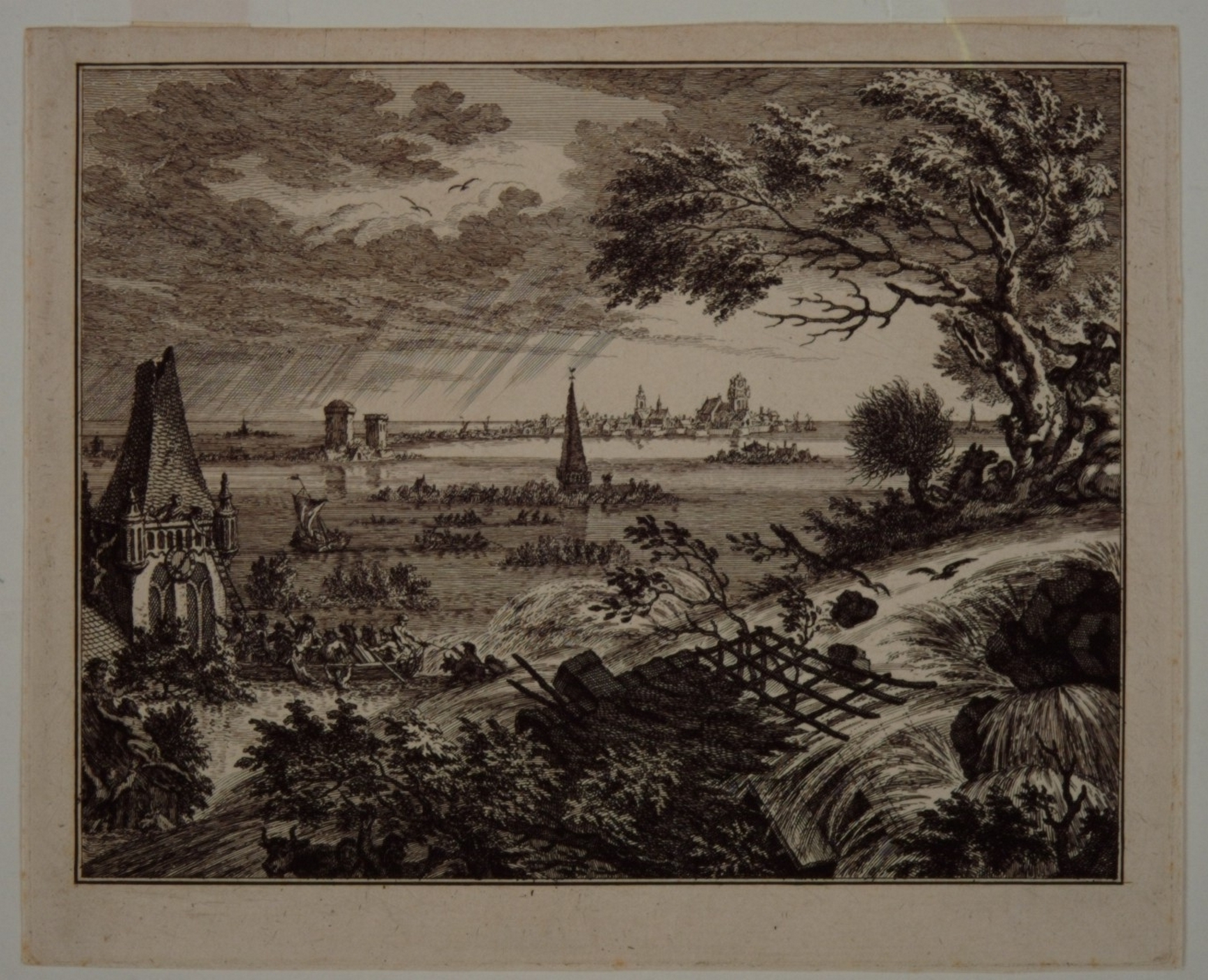 - Sint Elisabethsvloed, 18 november 1421. De afbeelding toont een dijkdoorbraak en de overstroming van de Zuid-Hollandse Waard. In de verte Dordrecht.