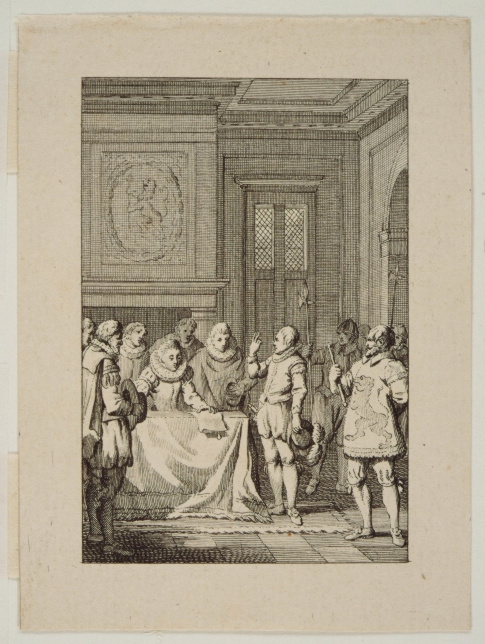 hxb: 8,1 x 5,4 cm. Naar de tekening van J. Buys. Proefdruk voor de letter. Uit: I. Fokke: De Geschied. d. Vereen. Nederl. voor de Vaderl. jeugd. (M 357a)