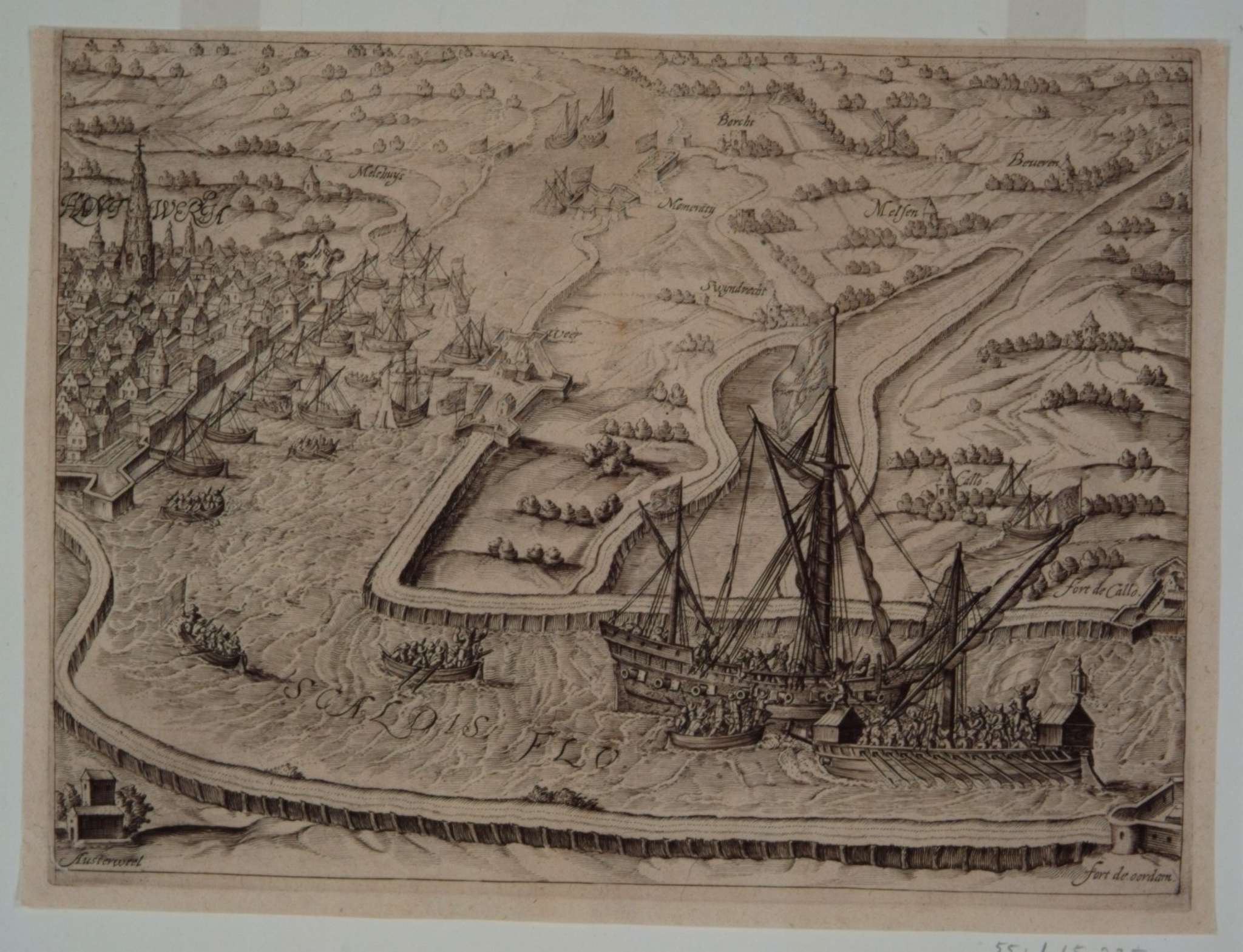 Afbeelding van de verovering door de Zwarte Galei van Dordrecht van een achttal schepen waaronder het Spaans admiraalschip voor Antwepen op 29 november 1600.