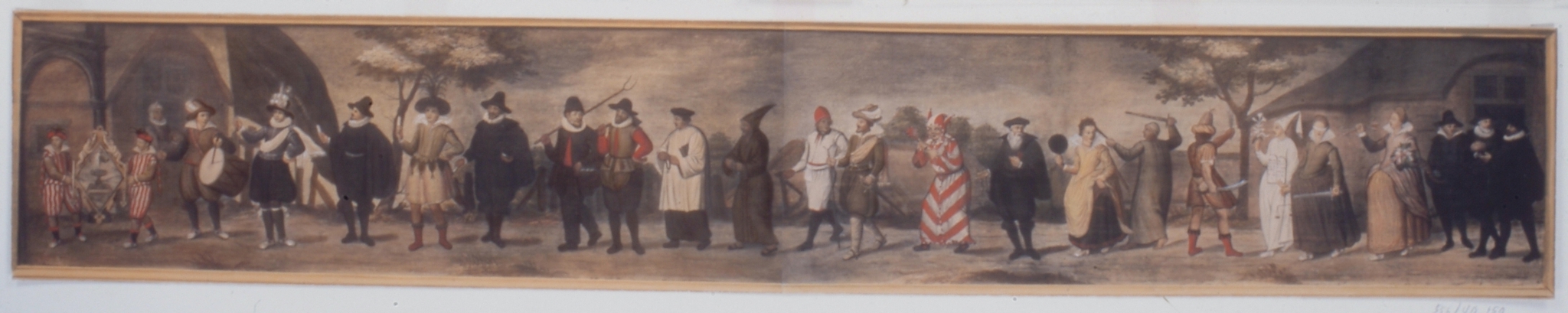 Afmetingen: Hg. 12.3, br. 76 c. Ingekleurde foto van schilderij van een onbekende meester in het Dordrechts Museum. Nota Bene: Vermoedelijk is dit schilderij een soort verslag van de intrede van de Dordtse kamer. Voorop in de stoet van 24 personen gaan twee knapen met het blazoen gekleed in de Dordtse kleuren, gevolgd door een tamboer, vaandeldrager en prins of factor; dan vertegenwoordigers der maatschappelijke standen: boer, ambachtsman, kanunnik, monnik, varensgezel en soldaat; vervolgens de zot, de overheid , de hovaardij, de tirannie, de godsdienst, de gerechtigheid en de overvloed.