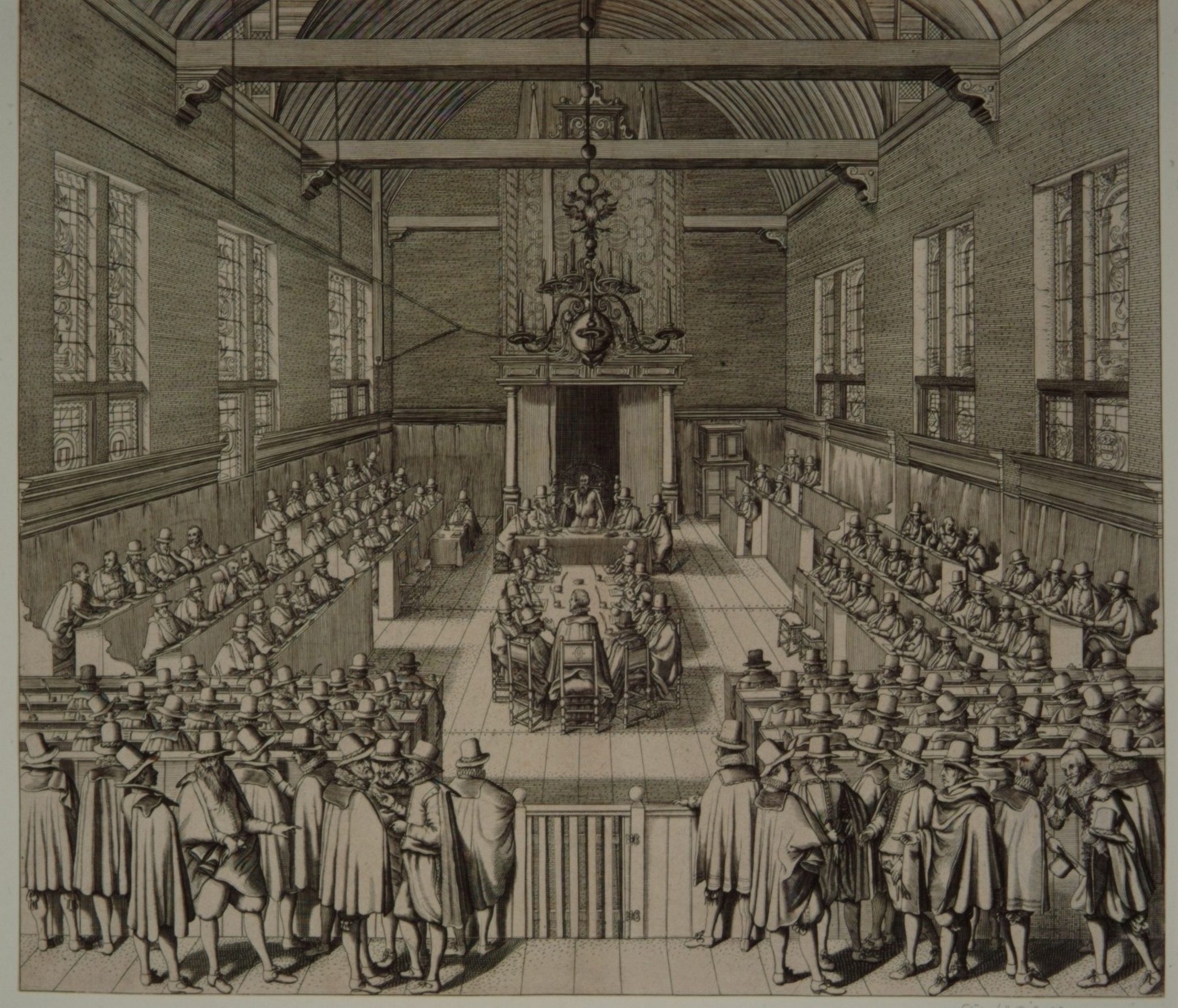- Afbeelding van een zitting van de Nationale Synode, gehouden in de Kloveniersdoelen van 13 november 1618 tot 29 mei 1619, met hierop de gedeputeerden en enkele mannelijke toeschouwers. .