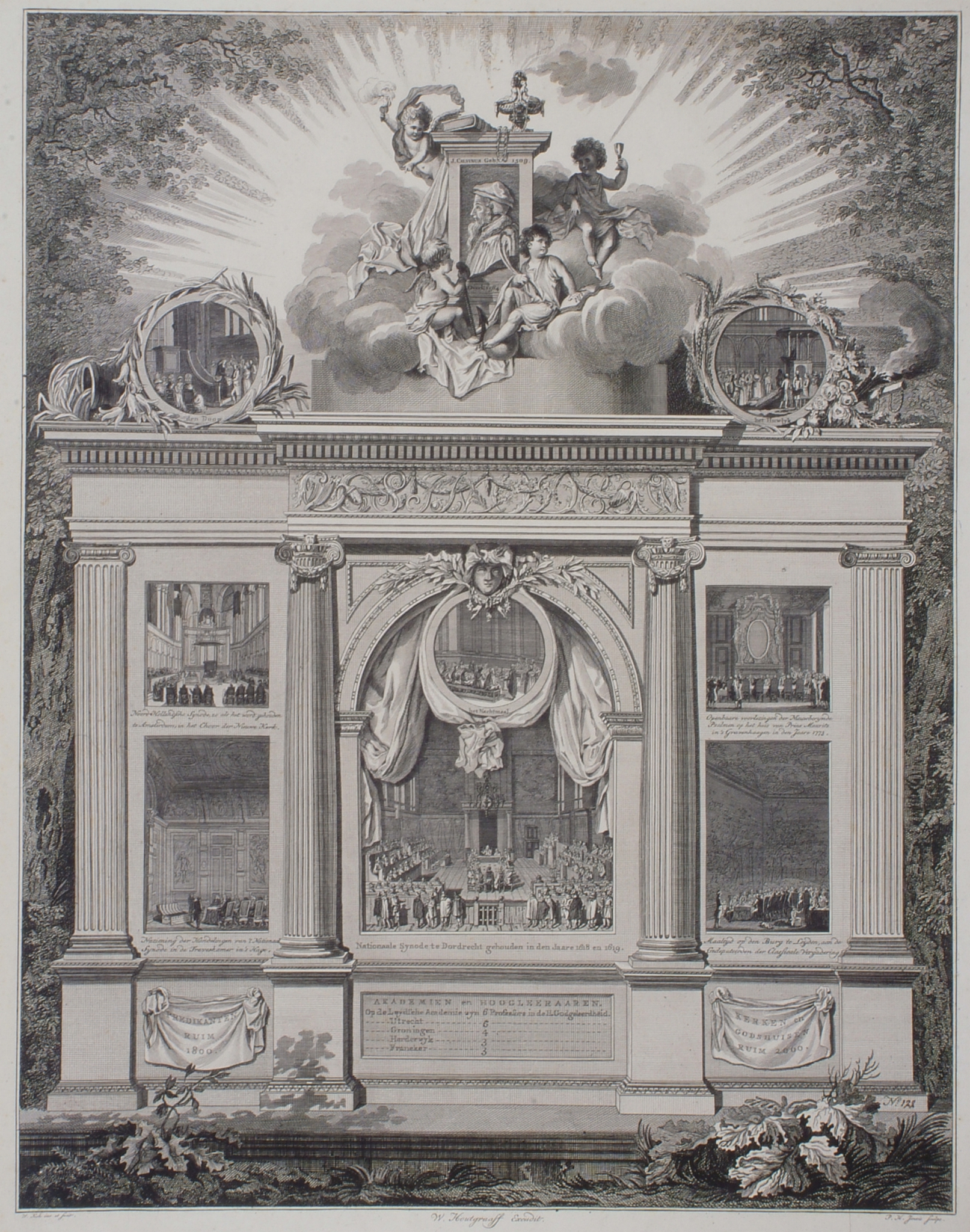 Gedenkstuk voor de Nederlandsche Gereformeerde Gemeenten; zinneprent met een achttal voorstellingen betreffende de Hervormde kerk, waarvan de middelste een afbeelding bevat van de Nationale Synode, gehouden van 13 november 1618 - 29 mei 1619.