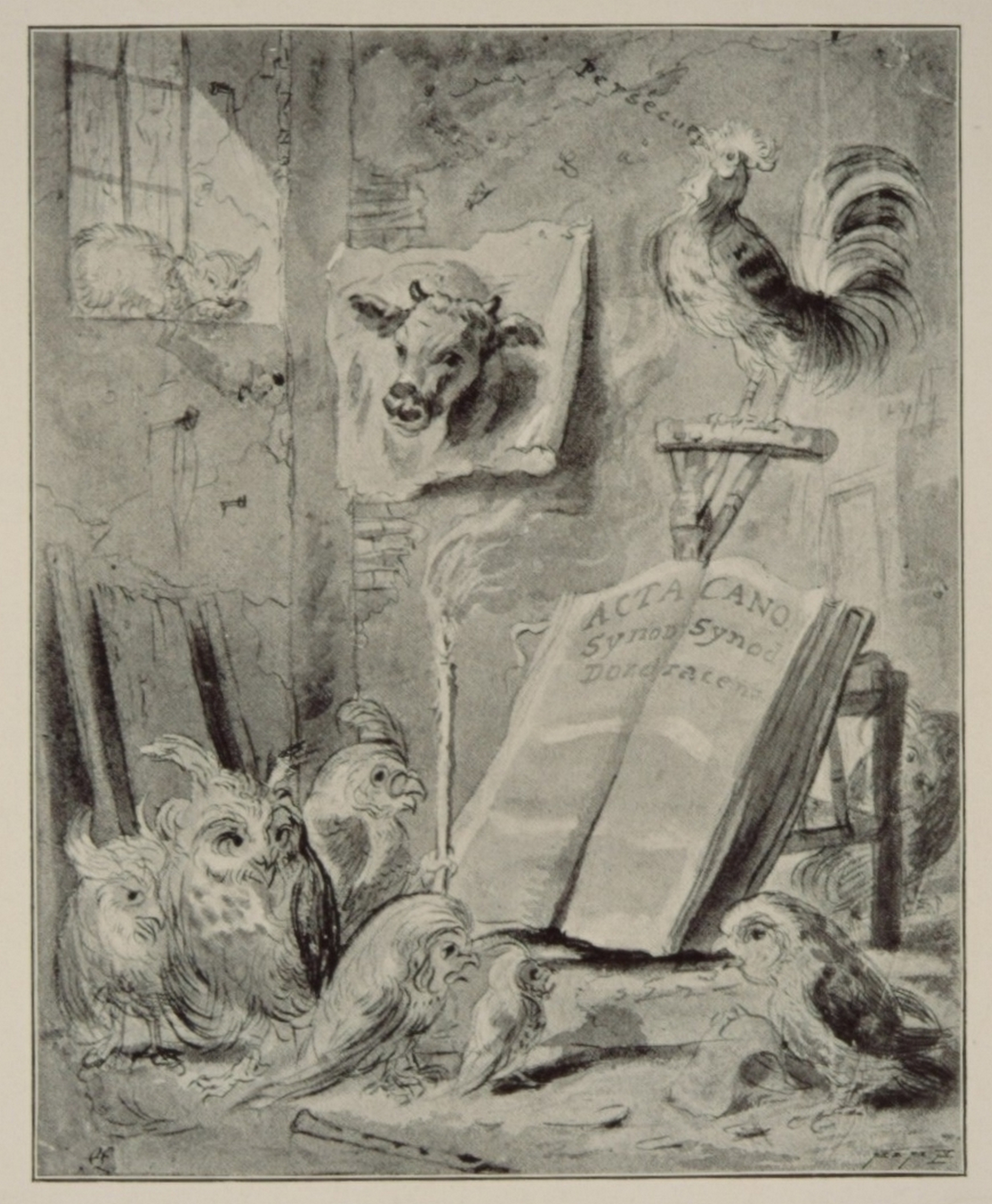 - Spotprent op de Nationale Synode. In een schuur staaat een haan (Bogerman) op de leuning van een driepotige stoel en kraait: 'Persecutie'. Op de grond tegen de stoel staat en boek met de inschriften"'Acta Synod' en 'Cano Synod. Dordracena', daarnaast verchillende uilen, die Faukelius, Rolandus, Heinsius, en andere Synode-leden moeten voorstellen. Links in het venster een kater of muyzer (Muys v. Holy, Schout v. Dordt), een papier aan de wand toont een kalfskop, als portret van Calvijn.