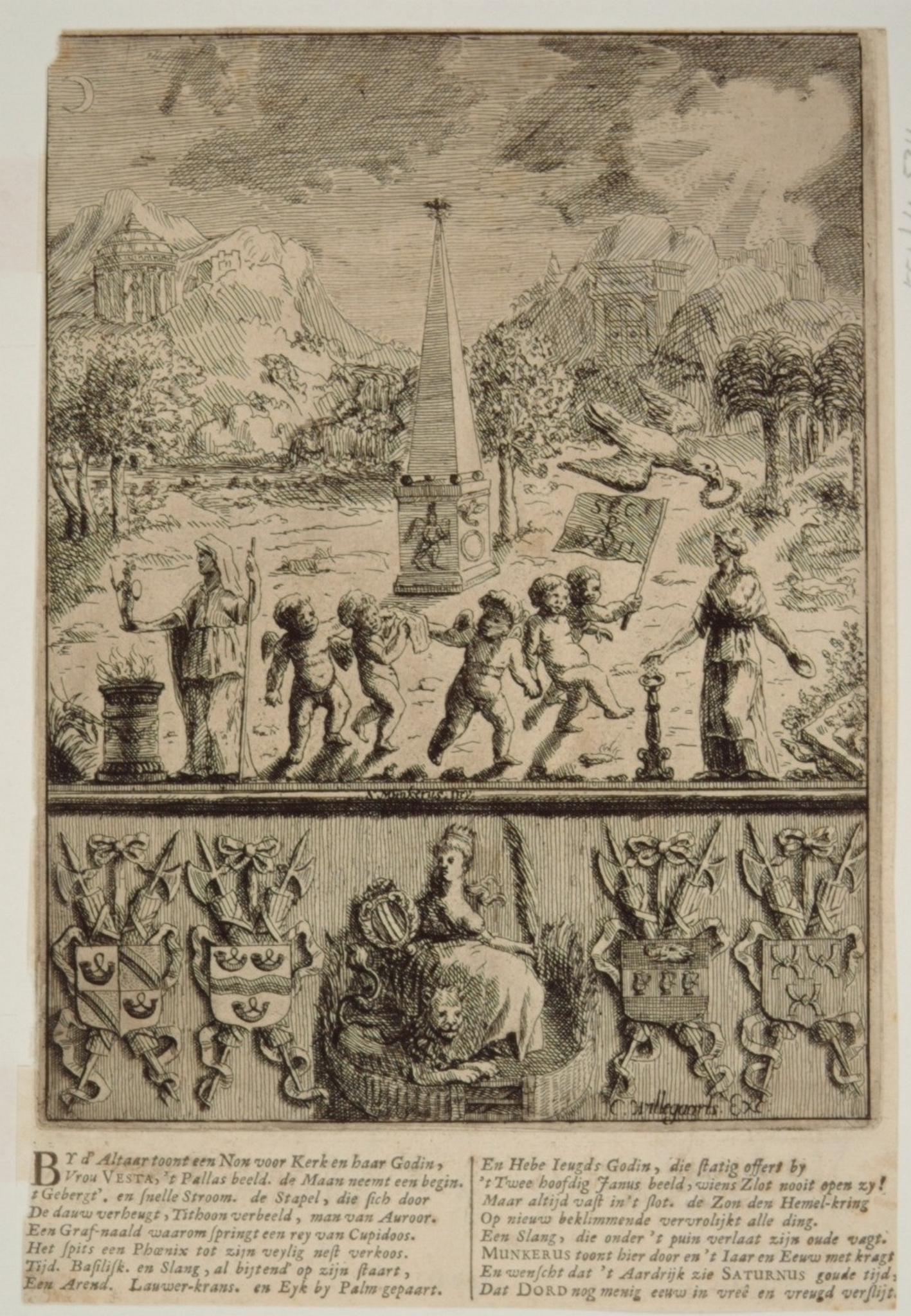 - Zinneprent op het jaar 1700 in twee gedeelten. De bovenste voorstelling stelt een landschap voor met daarin de priesteres Vesta, dat een Pallasbeeldje boven een brandend altaar houdt, rechts Hebe dat offers brengt op een kleiner altaar, in het midden enige jubelende Cupido's, waarvan een met een vlag met het inschrift Sec XVII en het Christus monogram. Ook nog een grafnaald en op de achtergrond de tempels van Vesta en Janus. Op de onderste helft de Dordtse maagd, met de wapens van de burgemeesters, Meyndert Segwaert, Rudoplh Eelbo, Abraham Stoop en Pompejus de Roovere Onder de afbeeldingen is nog een vers in twee kolommen gedrukt