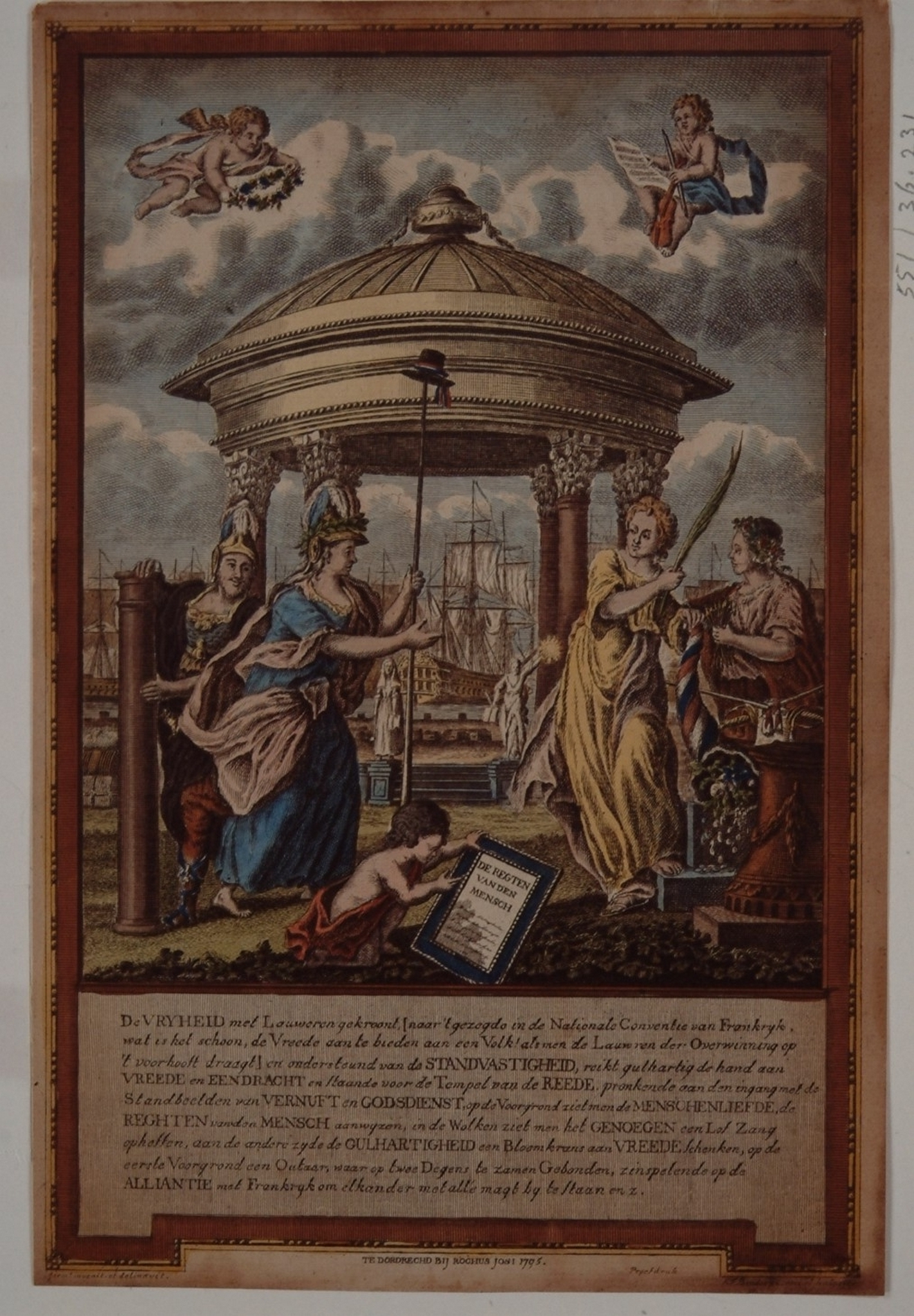 - Zinneprent van Afkondiging van de rechten van de mens en burger op 31 jan. 1795. De Vrijheid vegezeld van Standvastigheid, reikt de hand aan Vrede en Eendracht; op de achtergrond de Tempel der Rede, op de voorgrond de Mensenliefde de Rechten van de mens aanwijzend.