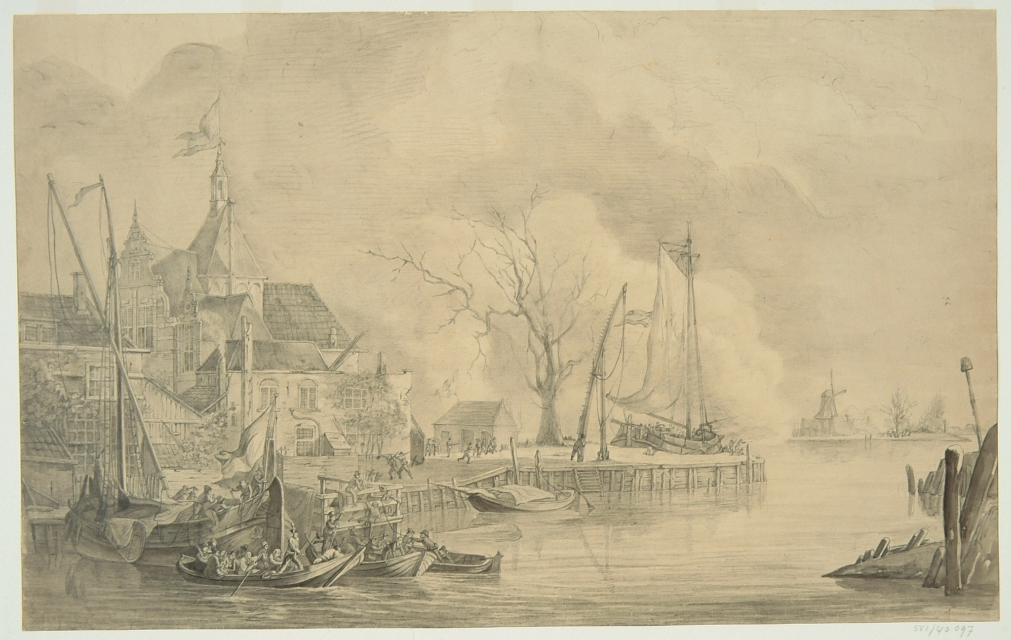 - Het beschieten der stad Dordrecht door de Fransen op 24 november 1813; gezicht in de monding der Riedijkshaven met voor het hoofd een kanonneerboot, die vuurt in de richting van het Papendrechts veer, waar van de trasmolen aldaar de Franse vlag waait; op het torentje der Riedijkspoort is een man bezig een Dordtse vlag te bevestigen.