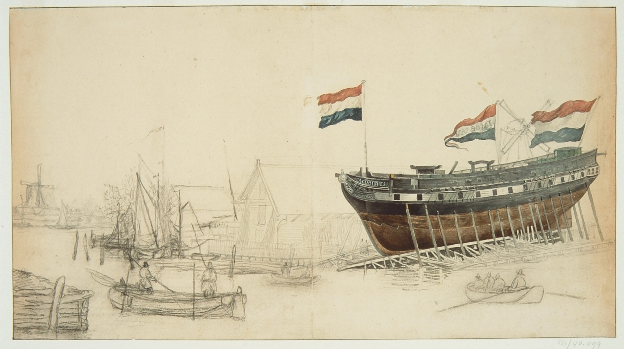 Onafgewerkte schets van het fregatschip Jacob Cats, op de werf van C. Gips en Zonen, aan de Riedijkshaven gereed liggende om op 14 maart 1835 te water te worden gelaten.