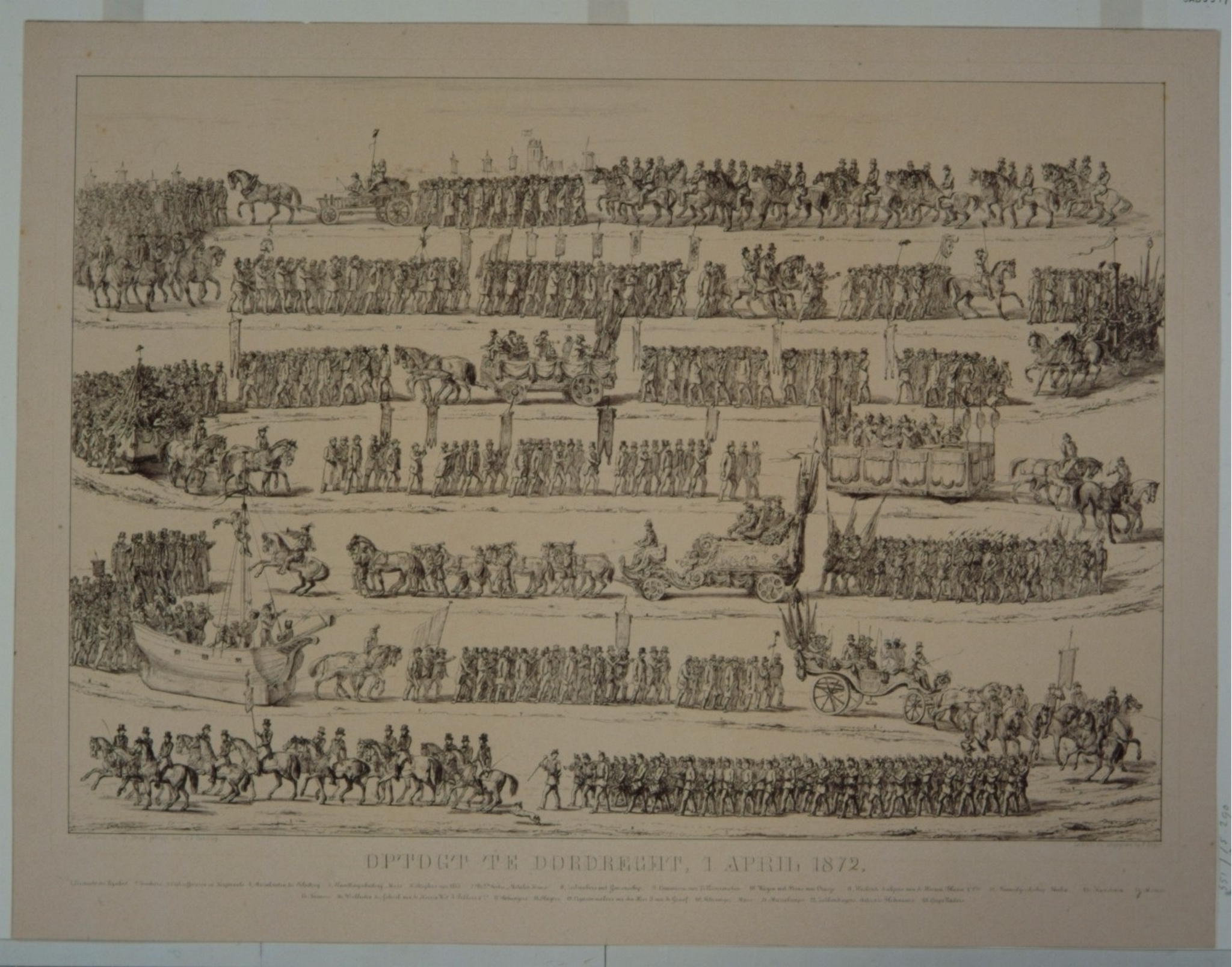 - Afbeelding van de optocht te Dordrecht op 1 april 1872 als feestelijke viering van het derde eeuwfeest van de inneming van Den Briel.