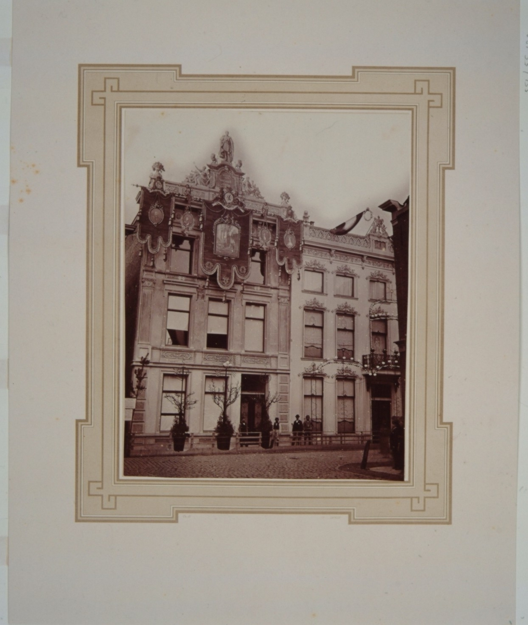 - Twee feestelijk versierde huizen aan de Voorstraat 130 en 132 van jhr. F.J. van den Santheuvel tgv 25-jarig regeringsjubileum koning Willem III; 12 mei 1874