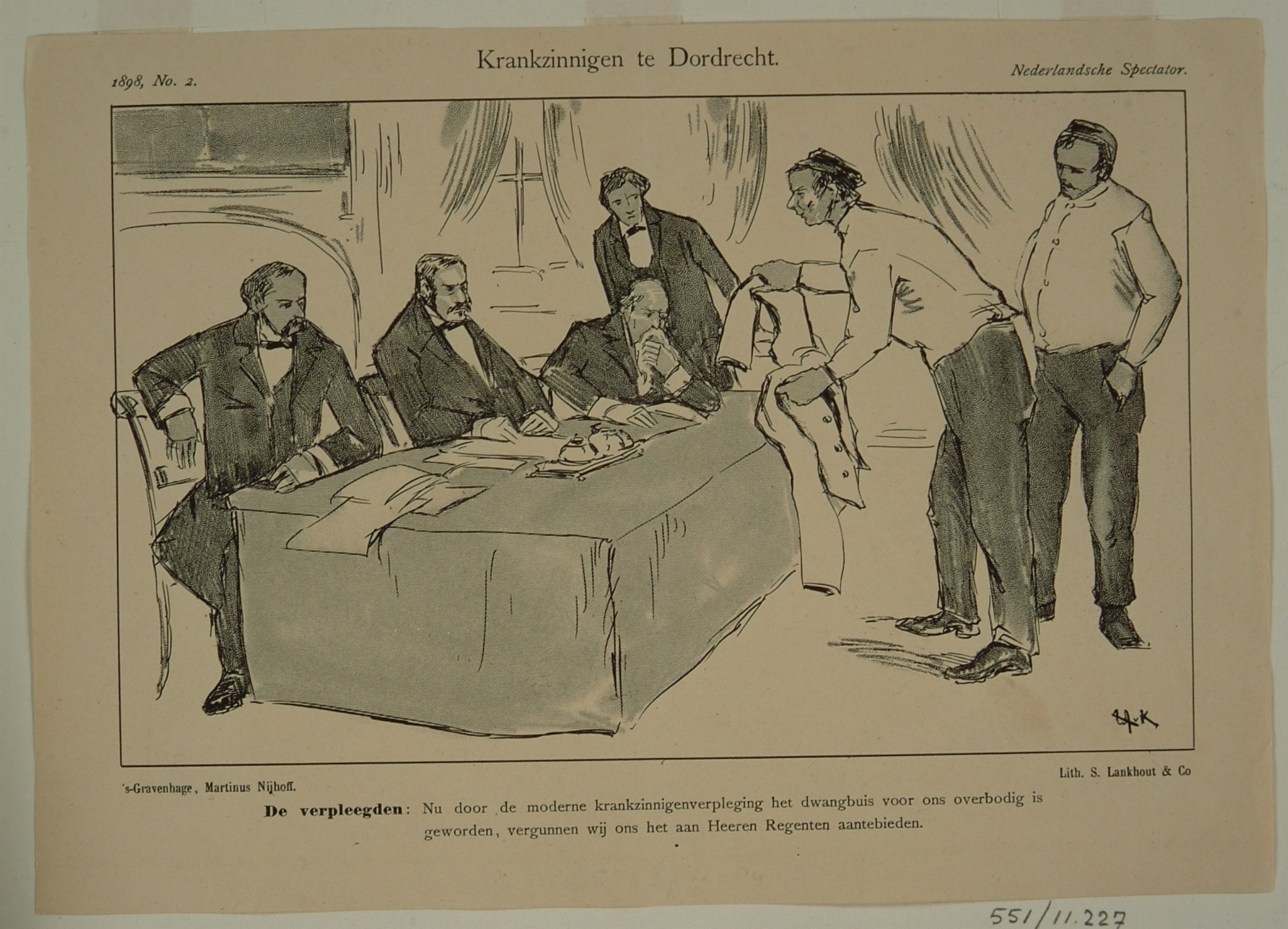 Spotprent op een voorval in het krankzinnigengesticht in Dordrecht op 28 december 1897. Aanbieden van dwangbuizen aan de regenten door de verpleegden. Door de moderne wijze van verpleging zijn deze onnodig geworden.