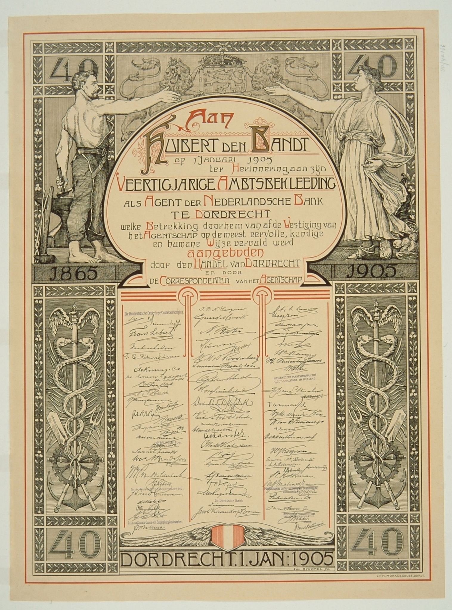 - Huldeblijk ter herinnering aan het veertigjarige ambtsjubileum van Huibert den Bandt als agent der Nedandsche Bank te Dordrecht op 1 januari 1905; met de handtekeningen der firma's, die aan de hulde deelnamen.