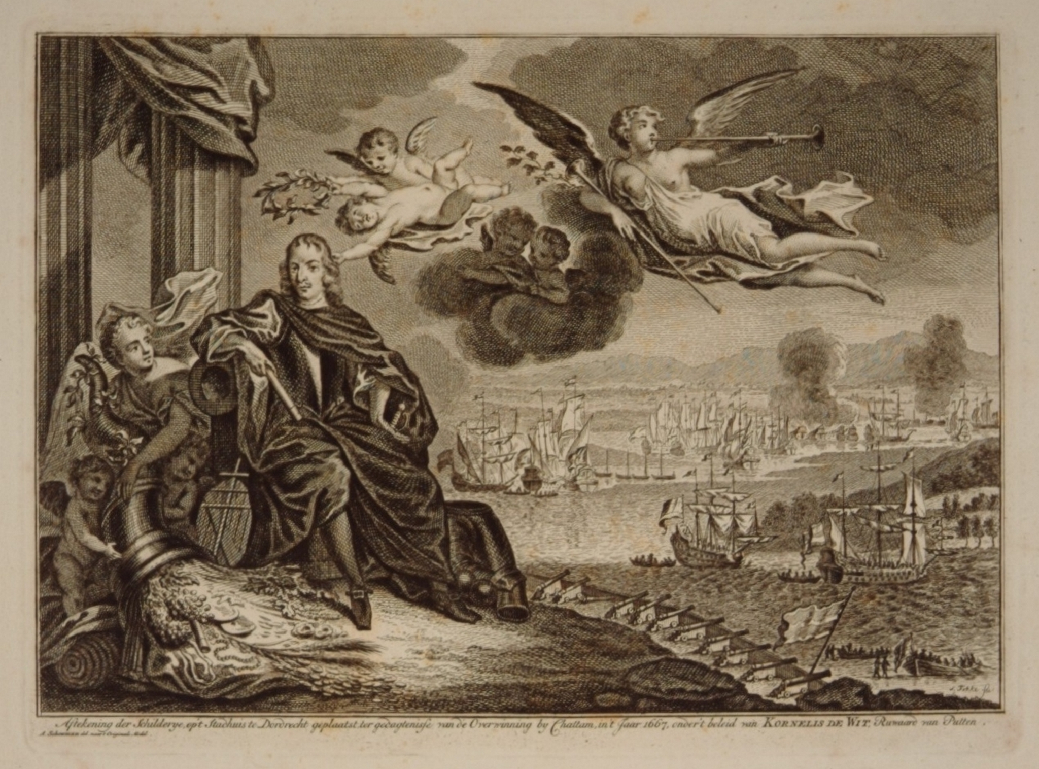 - Aftekening van een schilderij op het Stadhuis ter ere van Cornelis de Witt naar aanleiding van de tocht naar Chatham. De afbeelding toont Cornelis de Witt in harnas en mantel, zittend tegen een kanon, terwijl hij door een engel gekroond wordt. De Overvloed stort haar hoorn uit en Faam zweeft in de lucht. Op de achtergrond de Theems.
