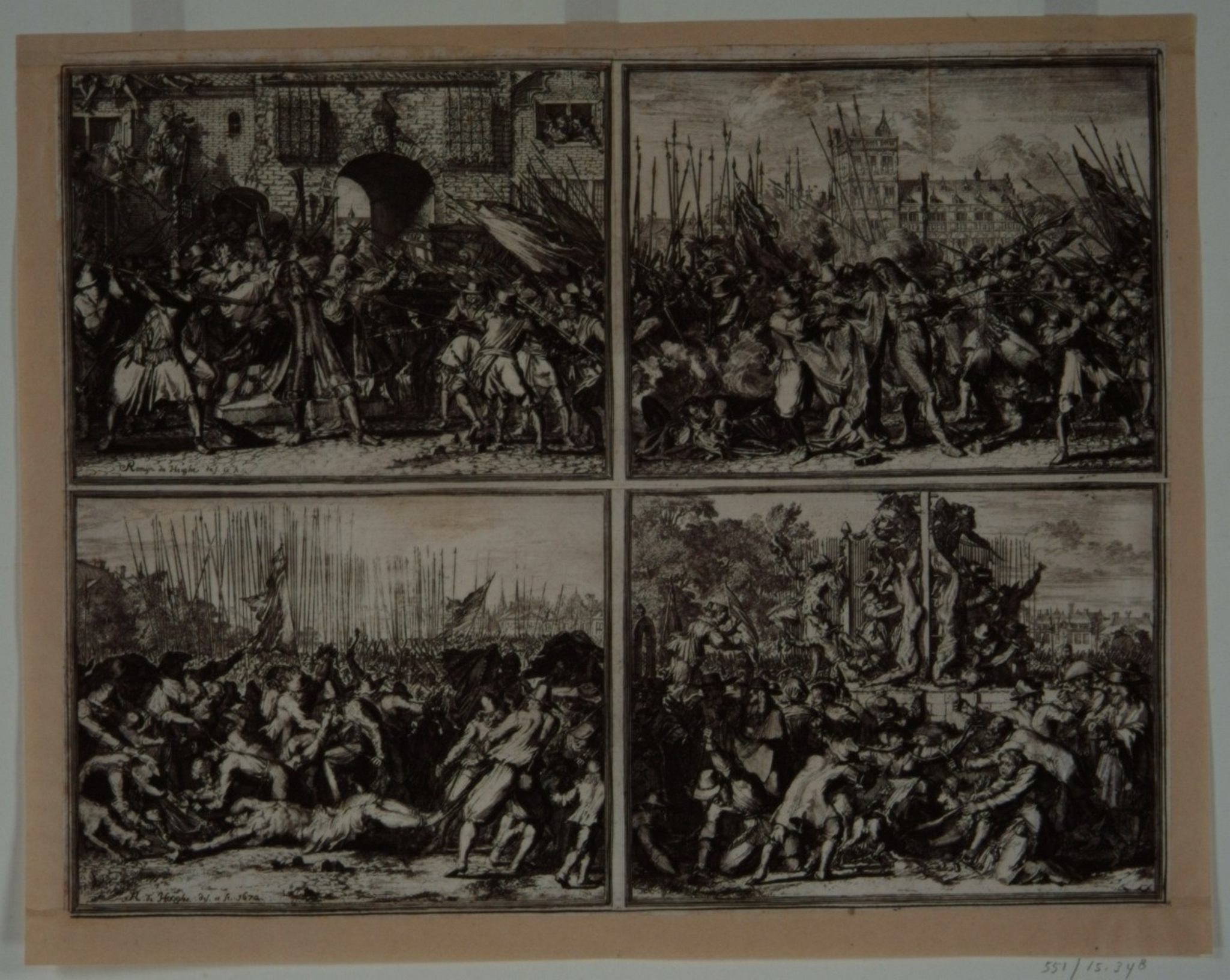 - De moord op de gebroeders De Witt op 20 augustus 1672; plaat in vier delen, voorstellende.: 1. Aanval op de gebroeders die uit de Gevangenpoort komen. 2. Het moordtooneel op de Plaats. 3. Het slepen der lijken naar het schavot. 4. De mishandeling der aan de galg hangende lijken.