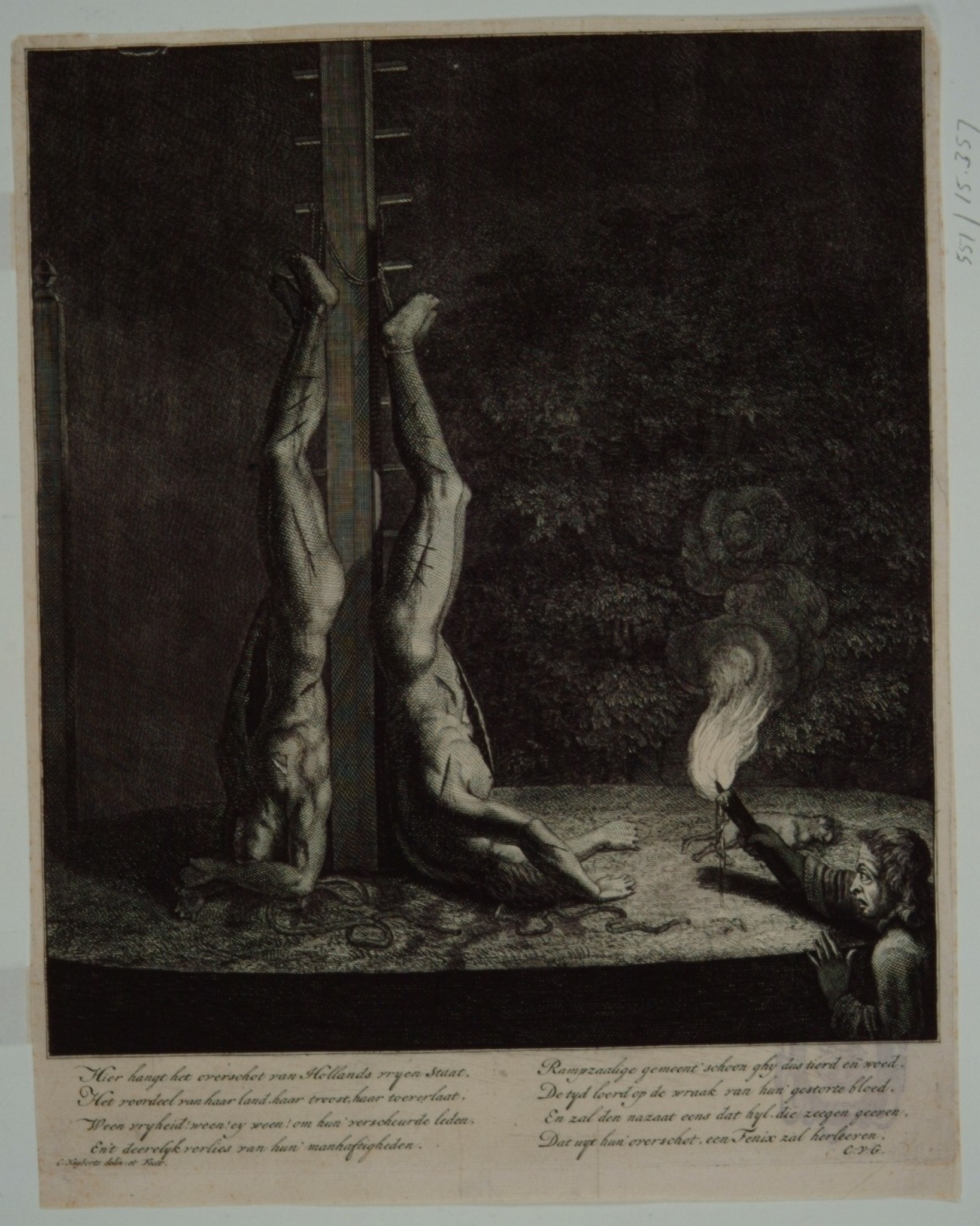 - De moord op de gebroeders De Witt op 20 augustus 1672; de deerlijk verminkte lijken van Johan en Cornelis de Witt aan de galg in de nacht na de moord; op het schavot een dode kat en rechts een man met een fakkel; onder de prent een 8-regelig vers van C. van G.