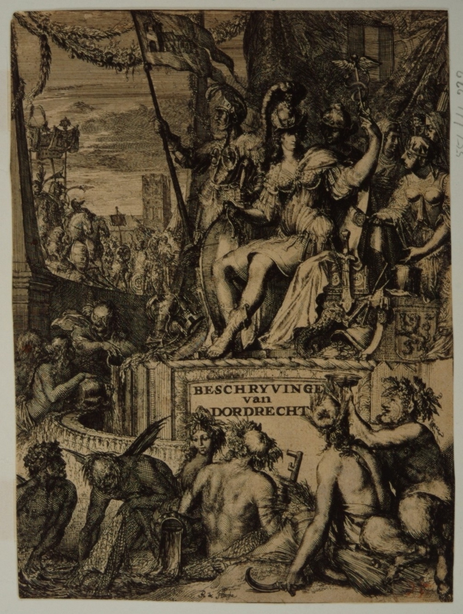 - Zinneprent op Dordrecht. De Dordtse maagd in Romeins kostuum gehuld en met een Mercurius-staf in de hand. Rechts van haar een krijger met banier in de hand met daarop een kerk. Links een vrouw met de attributen van de Munt. Op de voorgrond Bacchus en Ceres. Op de achtergrond een Romeins leger, waarvan de schilden zijn versierd met de wapens van Hollandse steden als Enkhuizen en Heusden.