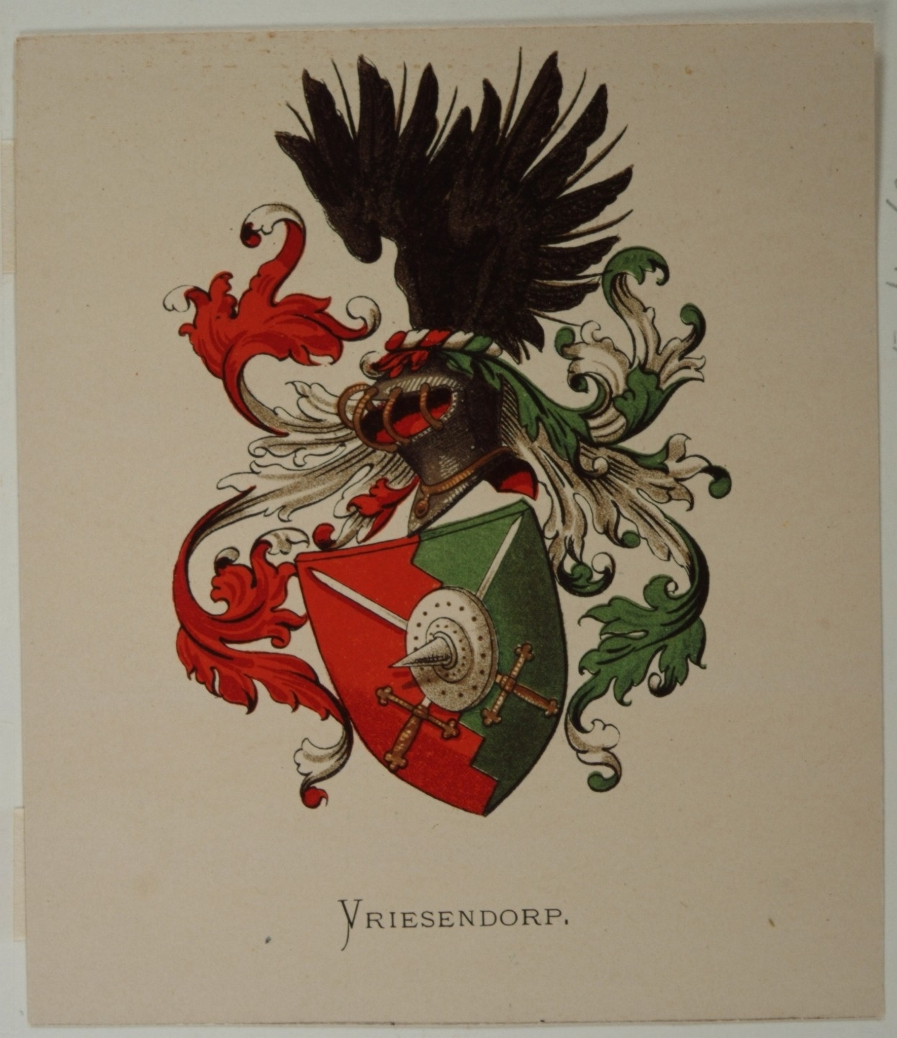 hxb: 14 x 8,5 cm. Uit: A.A. Vorsterman van Oijen, Stam- en Wapenboek, 1890. De Dordtse familie Vriesendorp stamt af van Hendrik Friesendorf, suikerraffinadeur uit Unna in Westfalen, die zich omstreeks het jaar 1700 in Dordrecht vestigde; Simon van Gijn merkt in zijn catalogus op dat het helmteken van dit wapen hier abusievelijk sabel is gekleurd, in plaats van keel en sinopel