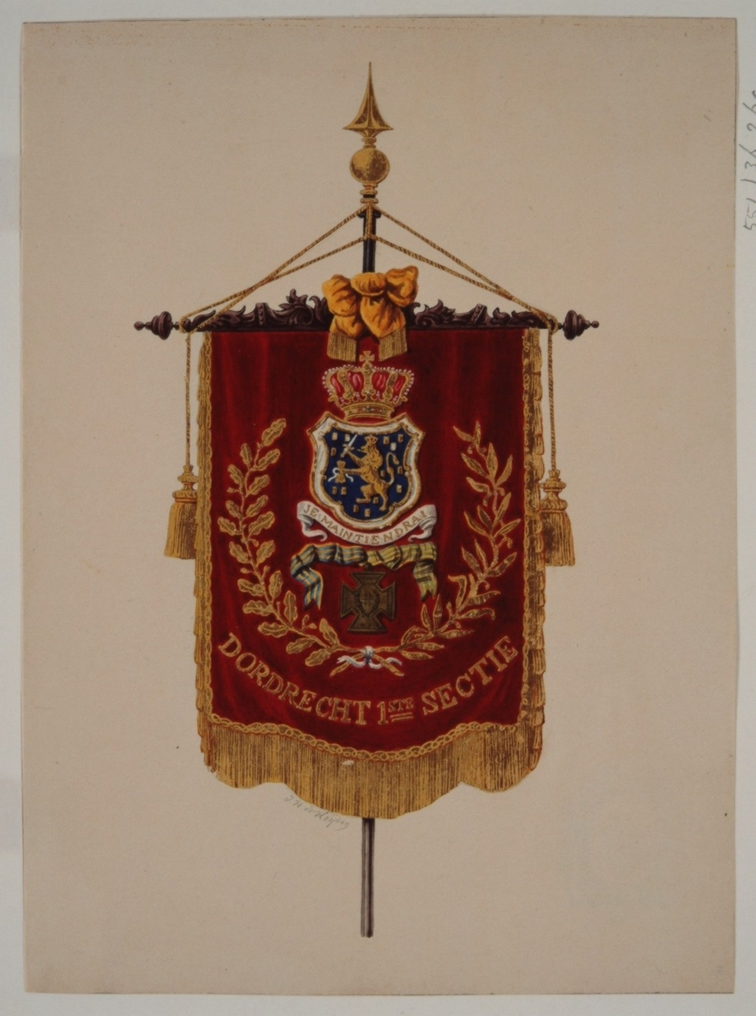 - hxb: 25,5 x 13,5 cm. Deze banier werd door de Douairière v. de Wall van Puttershoek- Repelaer bij missive van 21 januari 1861 aan de afdeling aangeboden.