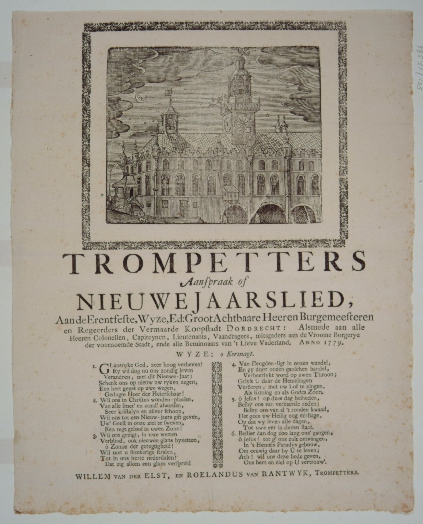 - Nieuwjaarswens van de trompetters voor het jaar 1779 met een afbeelding van het Stadhuis vóór 1671 en een gedicht in twee kolommen door Willem van der Elst en Roelandus van Rantwyk.