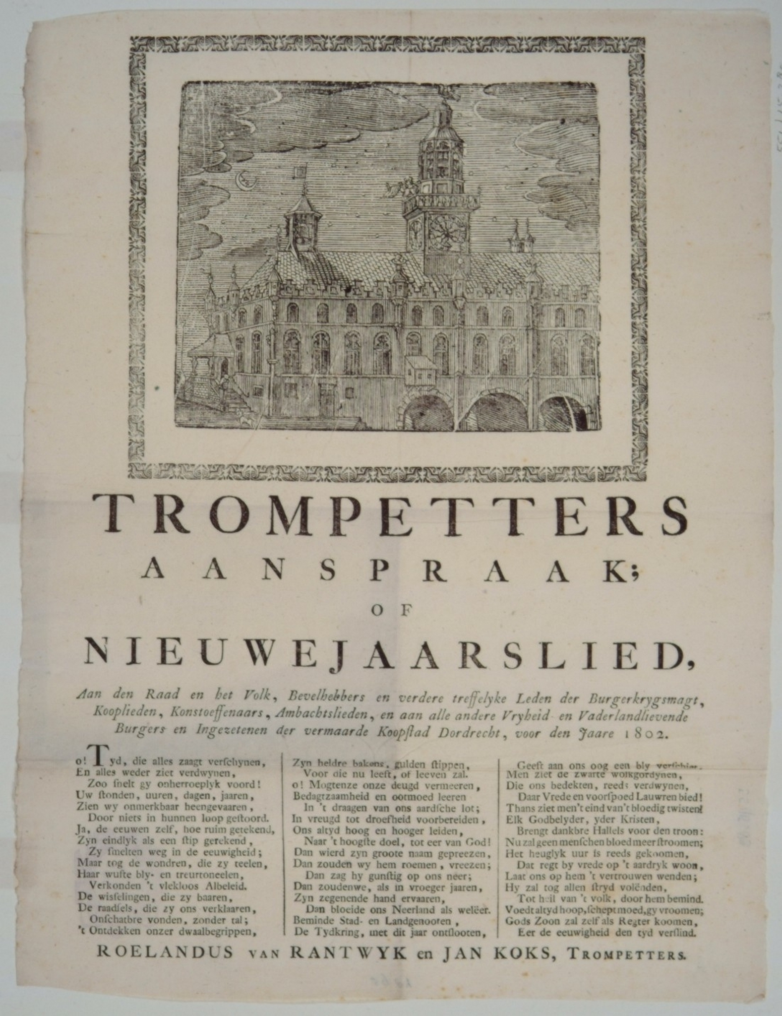 Nieuwjaarswens van de trompetters voor het jaar 1802 met een afbeelding van het Stadhuis vóór 1671 en een gedicht in drie kolommen door Roelandus van Rantwyk en Jan Koks.