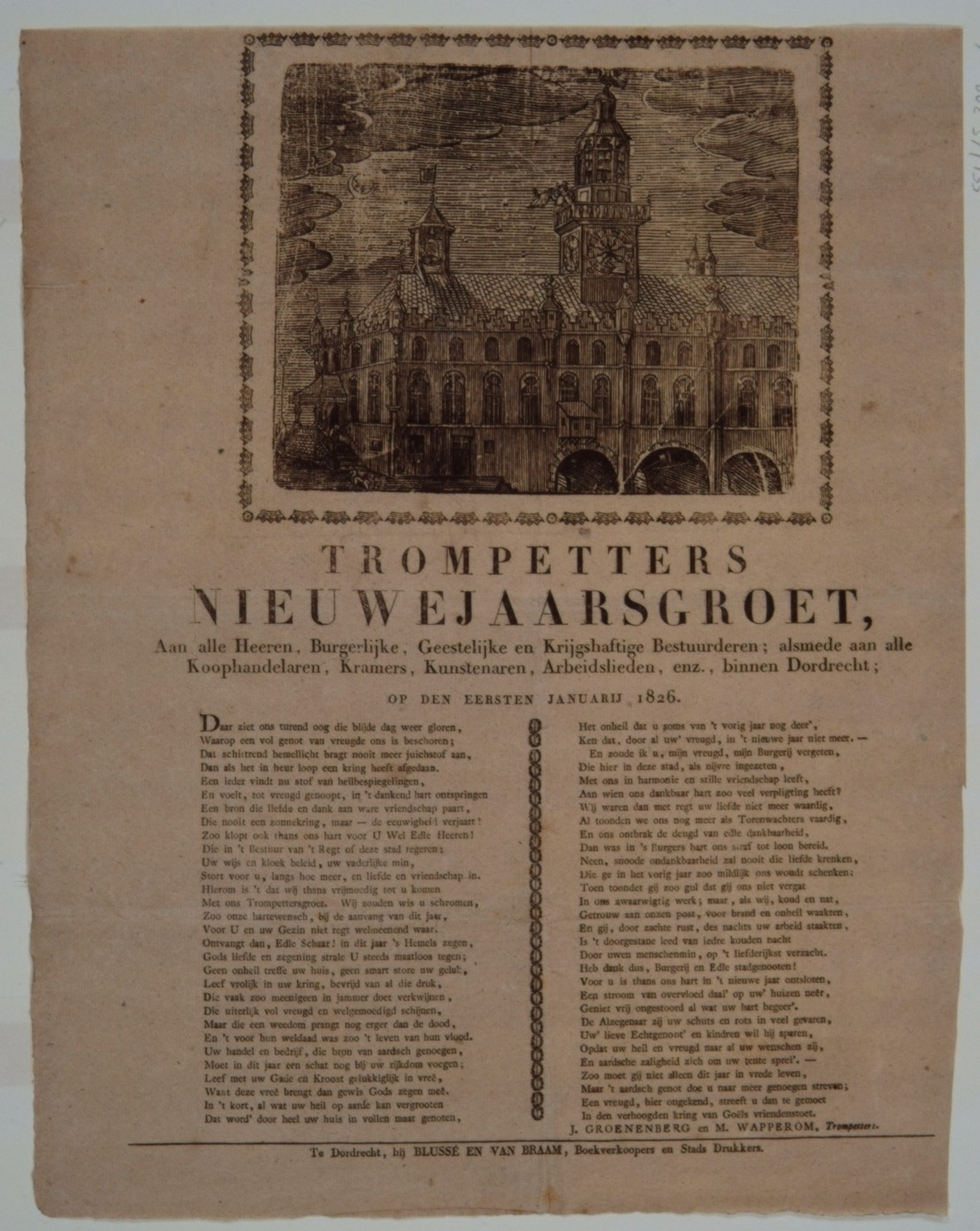 - Nieuwjaarswens van de trompetters voor het jaar 1826 met een afbeelding van het Stadhuis vóór 1671 en een gedicht in twee kolommen door J. Groenenberg en M. Wapperom.