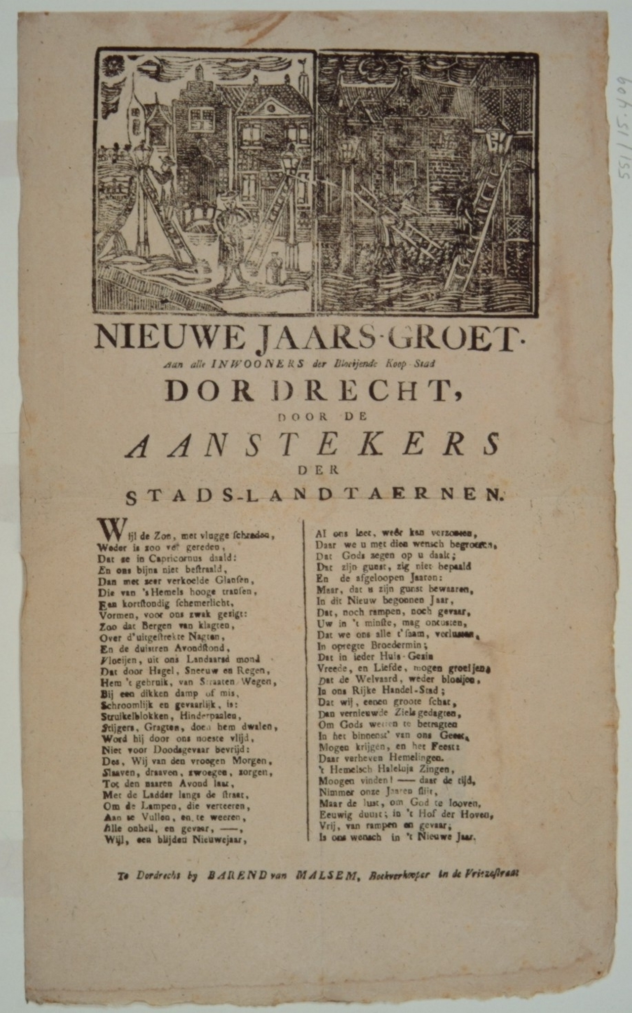 - Nieuwjaarswens van de lantaarnaanstekers der stad Dordrecht met een in tweeën gedeelde grove houtsnede met links de lataarnvullers en rechts de lantaarnaanstekers in de uitoefening van hun beroep en daaromder een gedicht in twee kolommen.
