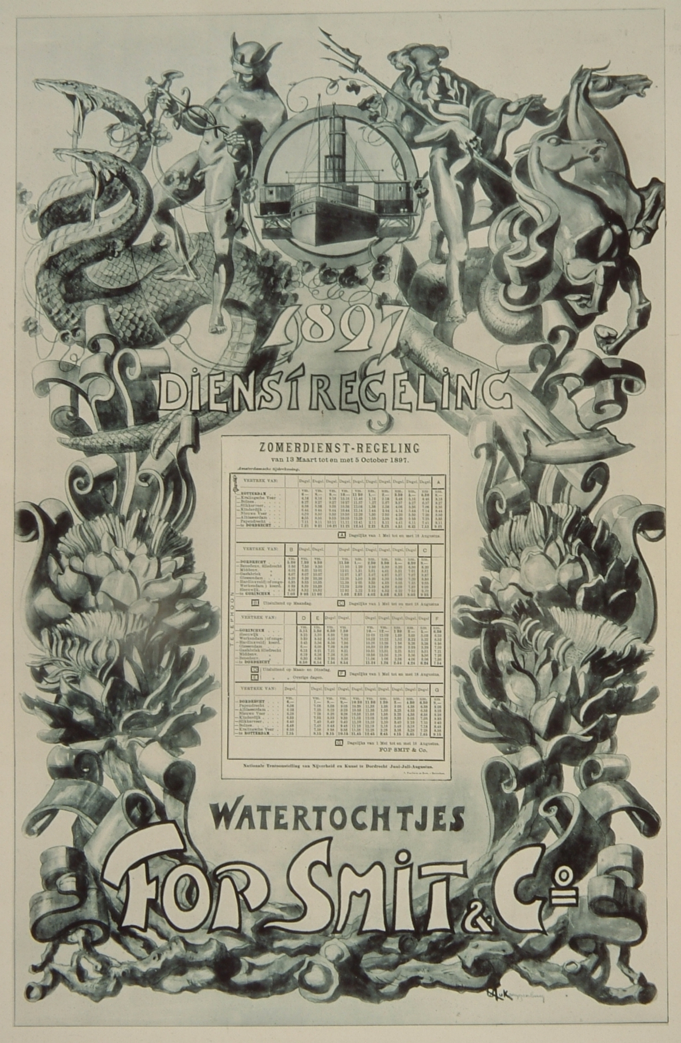 - Zomerdienstregeling 1897 van de stoombootdienst tussen Rotterdam, Dordrecht en Gorinchem van de stoombootrederij Fop Smit met een randwerk van planten waarboven een stoomboot en ter zijden Mercurius en Neptunus.