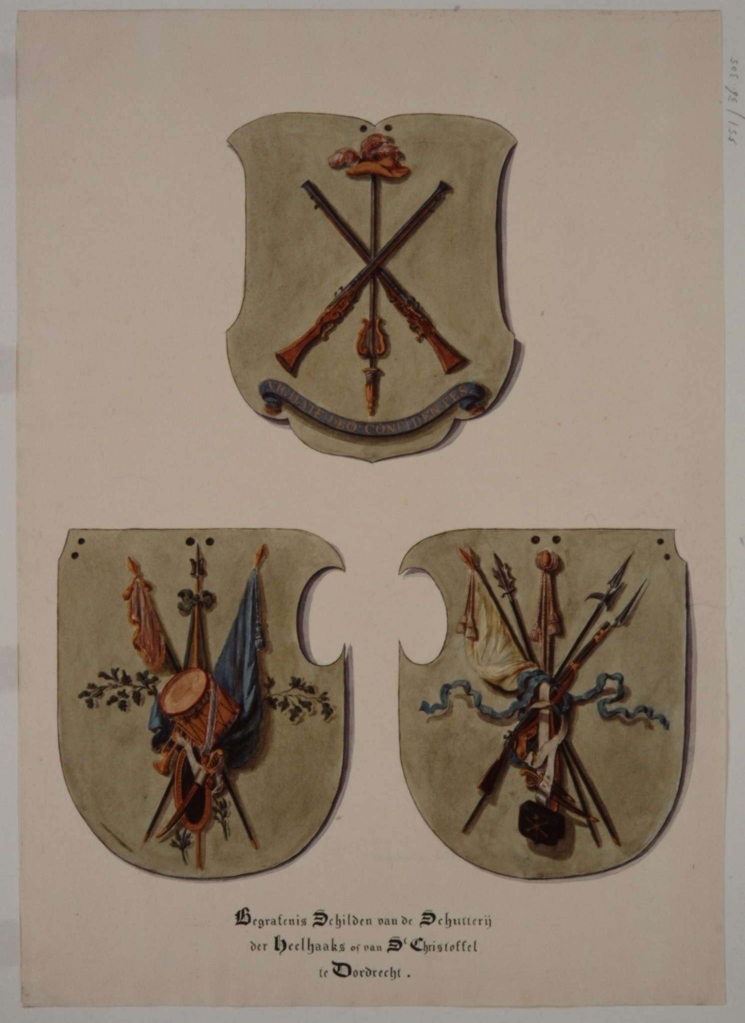 - Schutterij der Heelhaaks of van St. Christoffel. 3 koperen begrafenisschilden: a. met lans waarop een vrijheidshoed en twee gekruiste haakbussen; opschr.: Vigilate Deo confidentes. b. en c. met wapentropeeën, einde 18e eeuw.