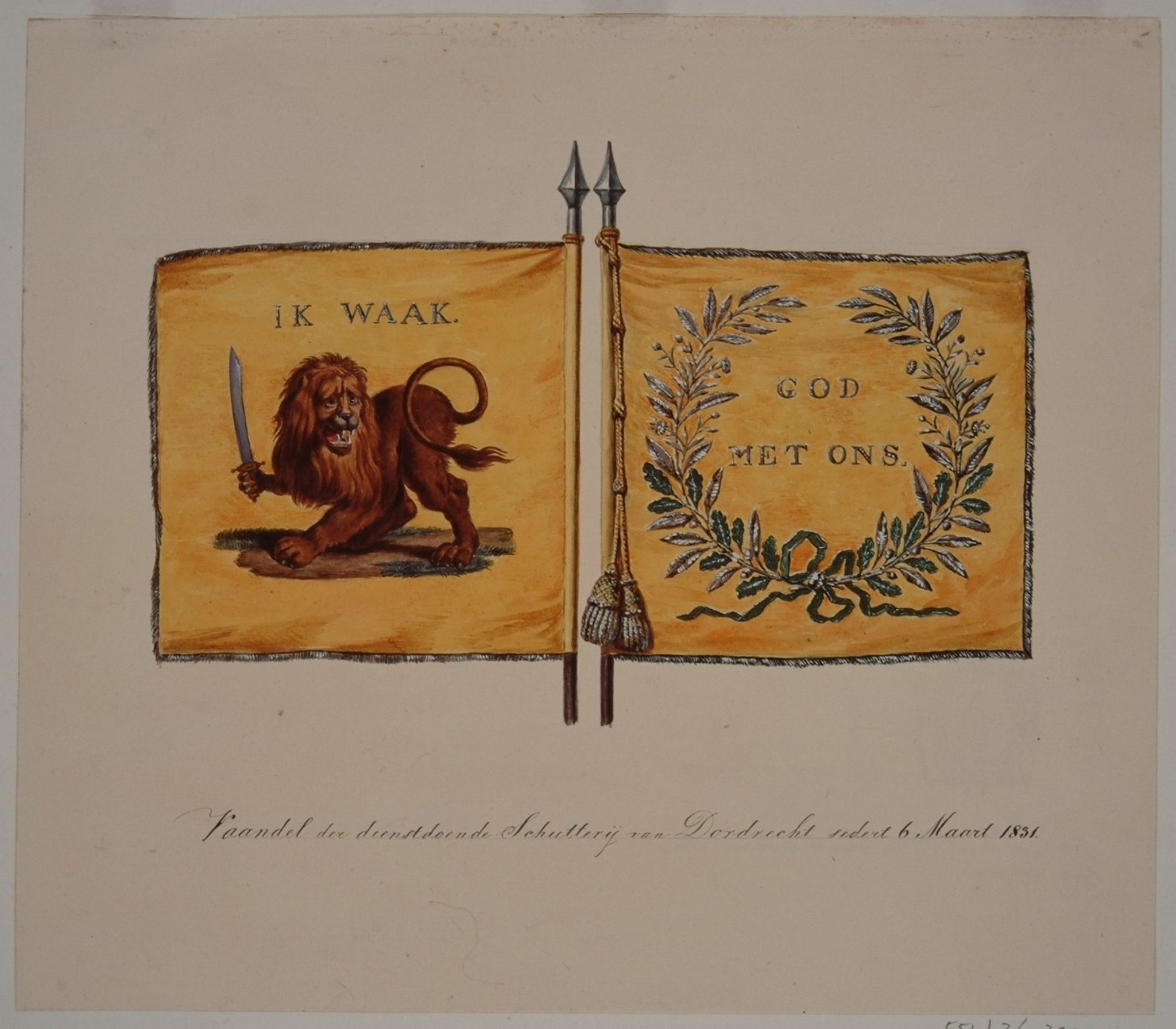 - Vaandel der Schutterij 1831. Oranje zijden vaandel, aan de ene zijde beschilderd met een leeuw met opgeheven zwaard en de spreuk: Ik waak. Aan de andere zijde, met in zilver en groen geborduurd, de woorden: God met ons, tussen oranje- en eikentakken.
