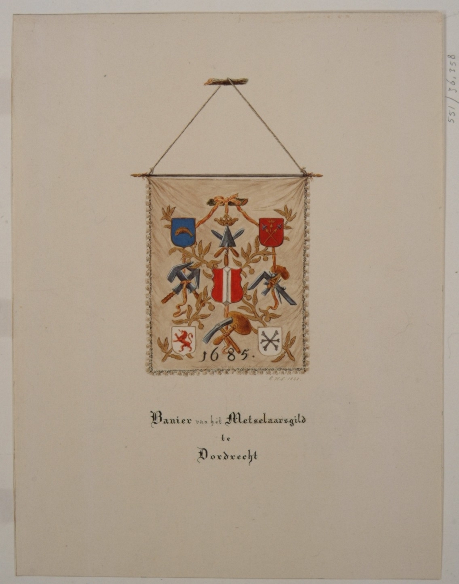 Banier van het Metselaarsgild te Dordrecht. Wit zijden banier met de attributen van de metselaars, steenhouwers en rietdekkers, het stedelijk wapen, vier wapens van overlieden (?), waartussen vergulde oranjetakken en het jaartal 1685.