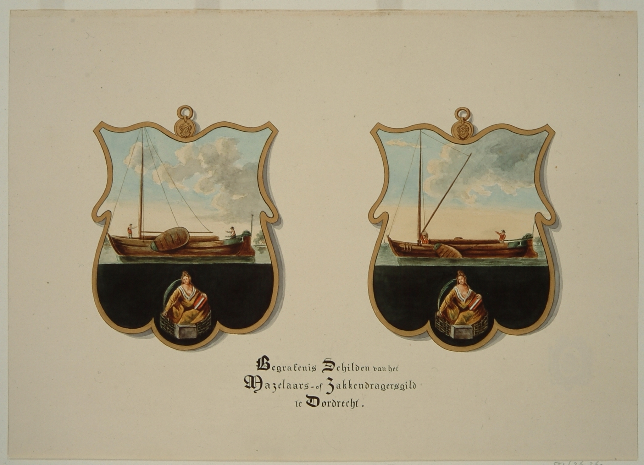 Begrafenisschilden van het Mazelaars- of Zakkendragersgild te Dordrecht: met afbeeldingen van binnenvaartuigen en de Dordtse Maagd in een omtuining gezeten