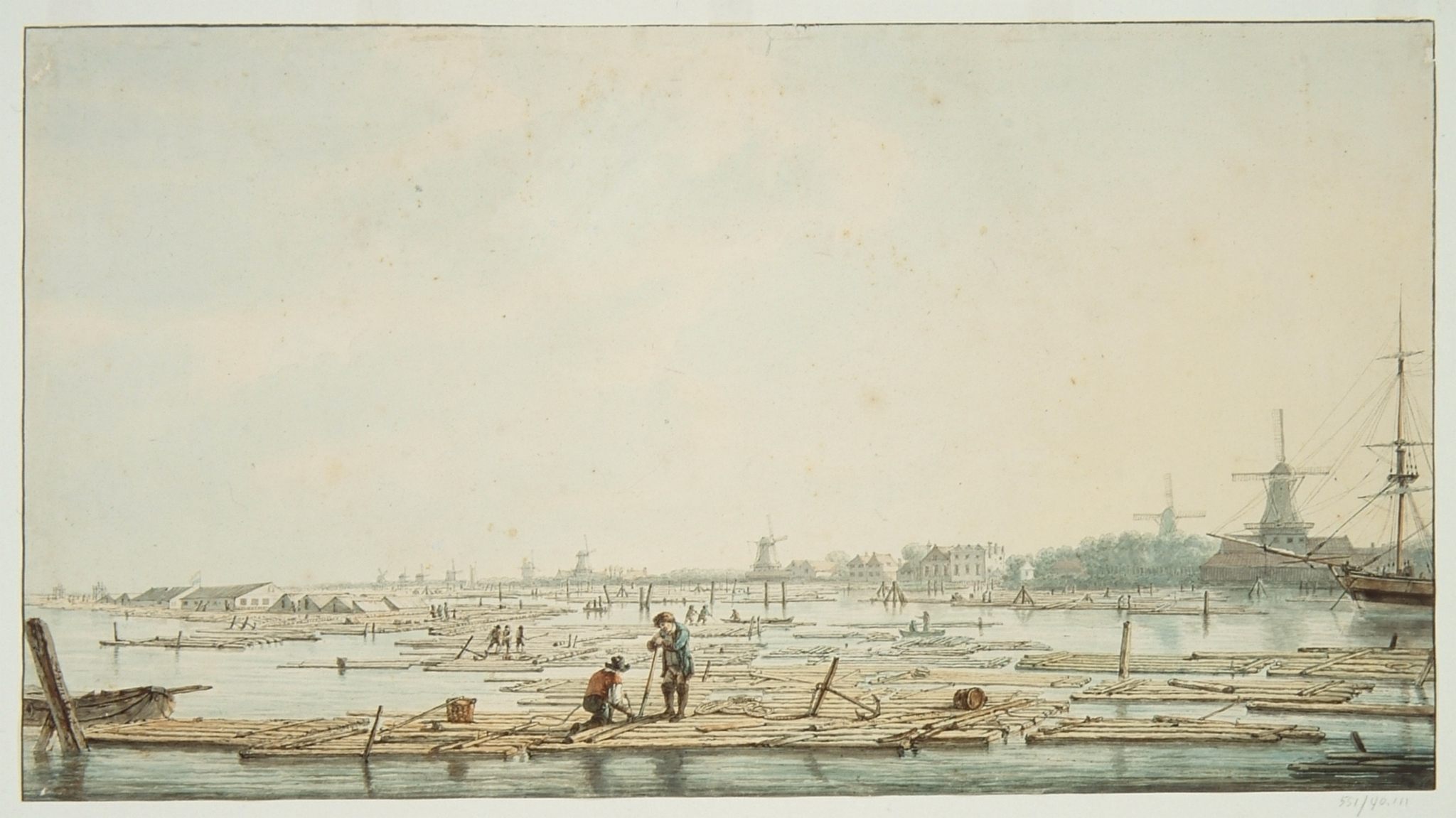 Het slopen van uit het Rijnland afkomstige houtvlotten op het Wantij met op de achtergrond molens aan de Noordendijk.