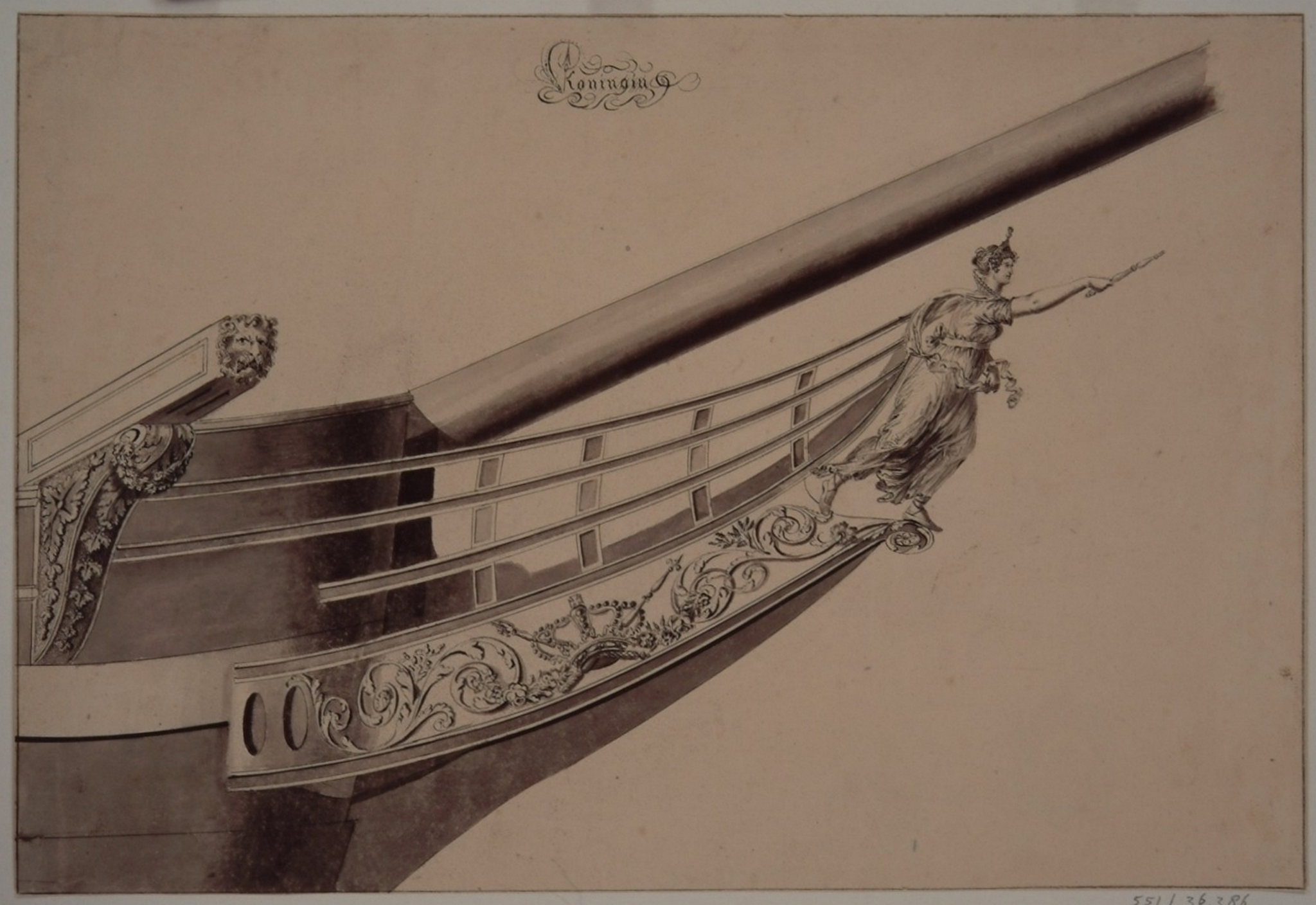 - Fregat Koningin der Nederlanden, anno 1830. Galjoen met boegbeeld van de vorstin