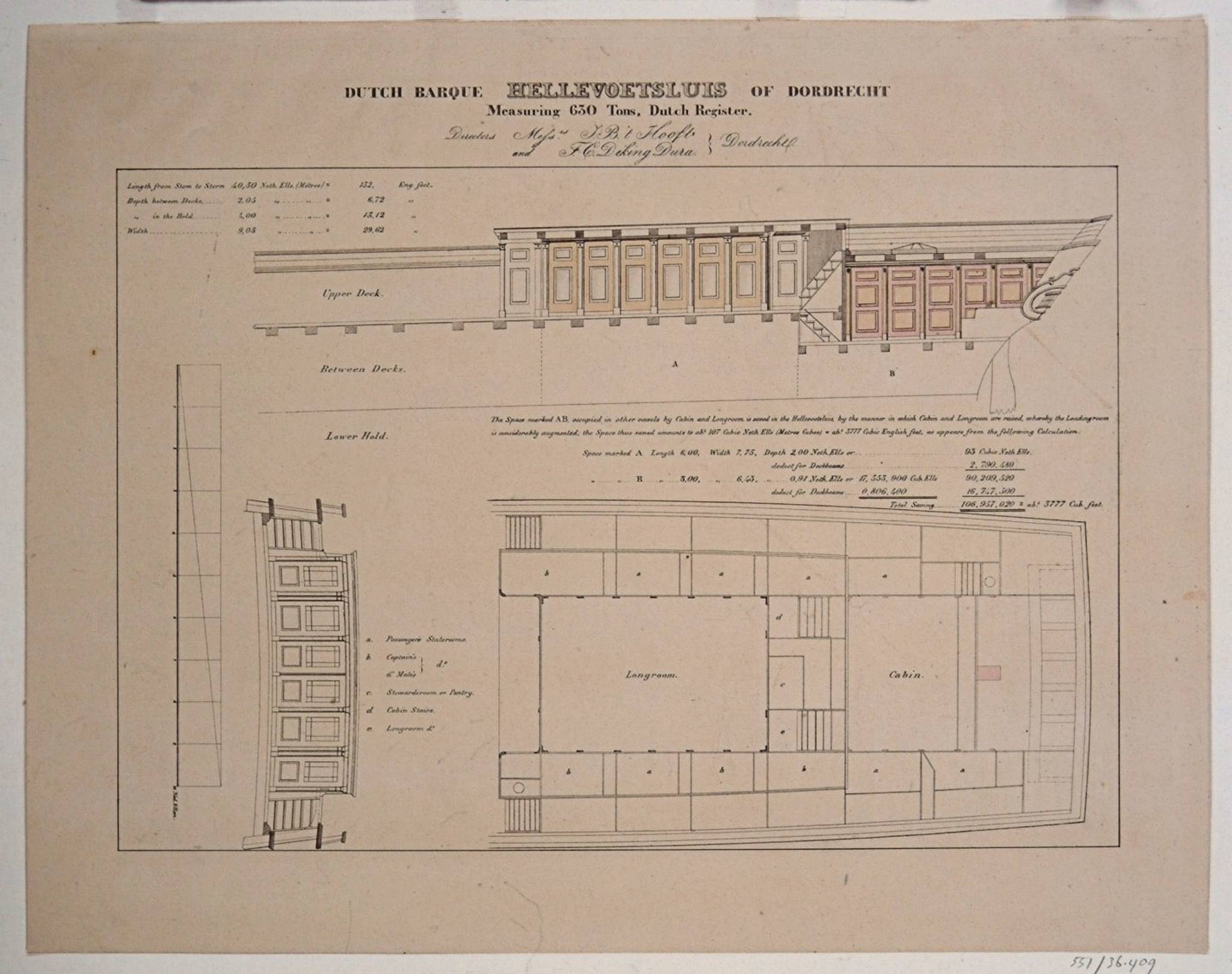 - Bark Hellevoetsluis, anno 1853. Dutch Barque Hellevoetsluis of Dordrecht. Doorsnede en plattegrond van de kajuiten van dit schip